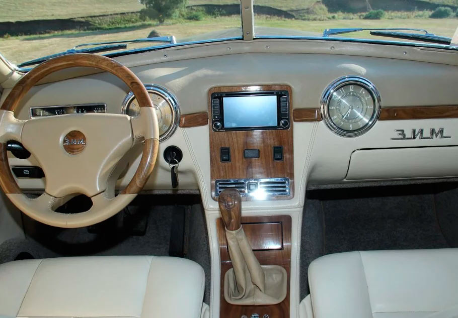Центральная консоль передней панели была сделана с нуля. Во-первых, она включает дисплей современной аудиосистемы, а во-вторых, тут расположен рычаг коробки передач. Напомним, что в оригинальном ЗИМе рычаг переключения передач располагался на рулевой колонке.