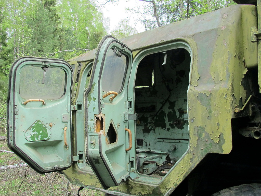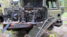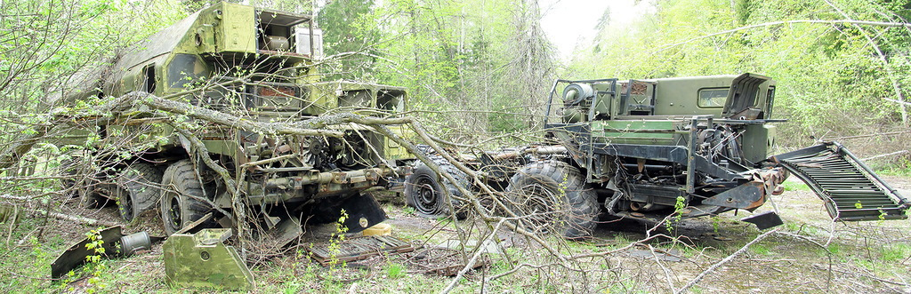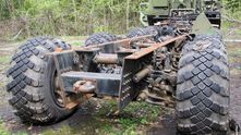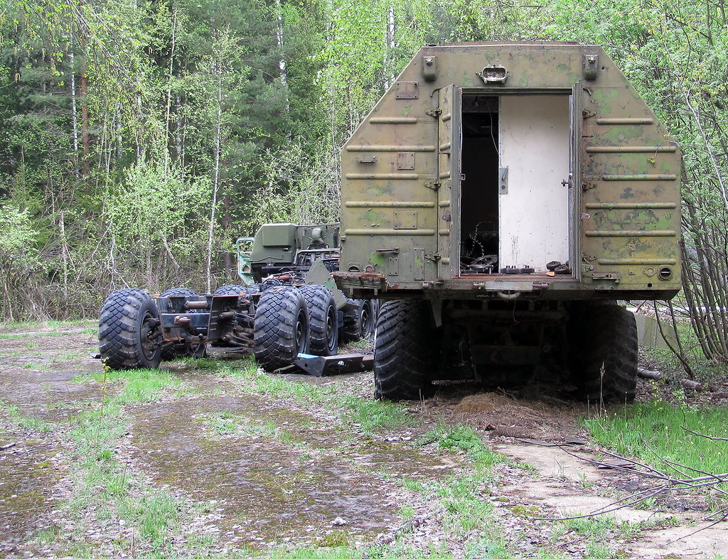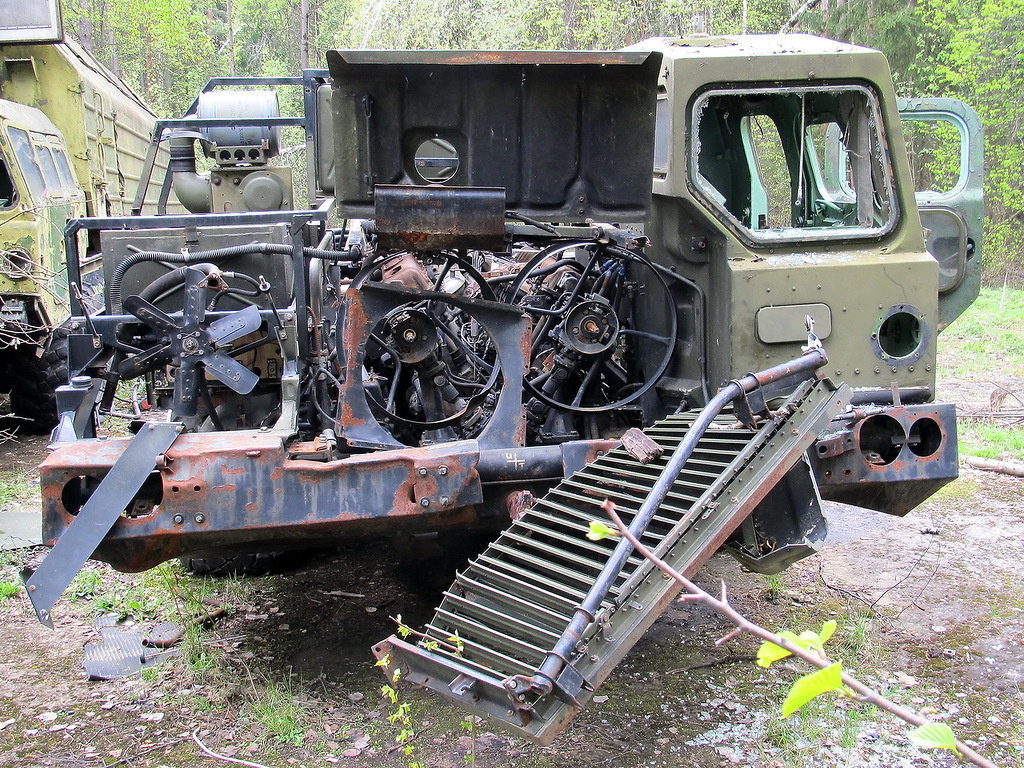 Один из них представляет собой шасси уже без КУНГа, двигательный отсек которого уже начали разбирать то ли на запчасти, то ли на сувениры.