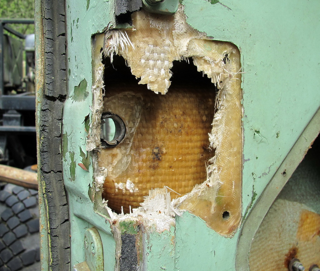 Интересно, что двери сделаны изнутри из стеклопластика. Не понятно, почему такое решение применили на военной технике. Неужели, ради снижения веса?