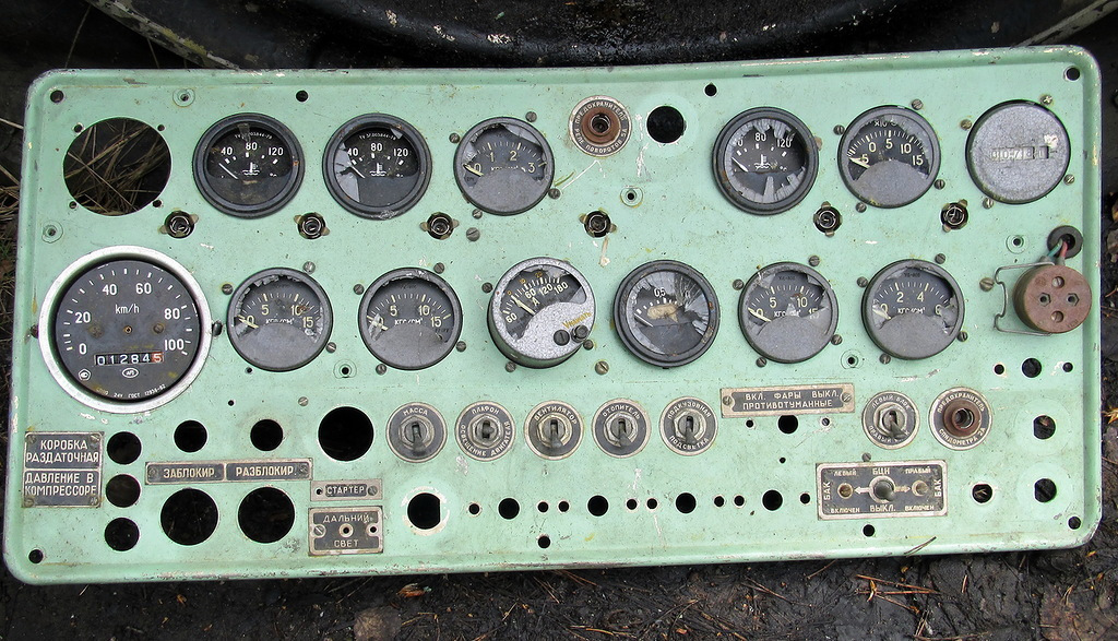 А это - панель приборов, вытащенная из кабины. Сколько же здесь различных указателей и датчиков. Автомобилистам, привыкшим к обычным легковушкам, тут просто так не разобраться.