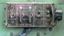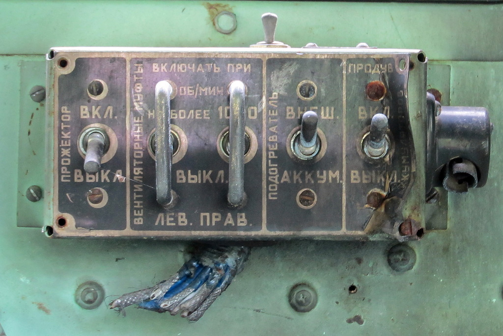 Внутри всё еще осталось несколько табличек. Обзор, кстати, сильно ограниченный. Как водители ездят на таких гигантах, из которых ничего не видно? Этот блок управления заведует прожектором и вентиляторами.
