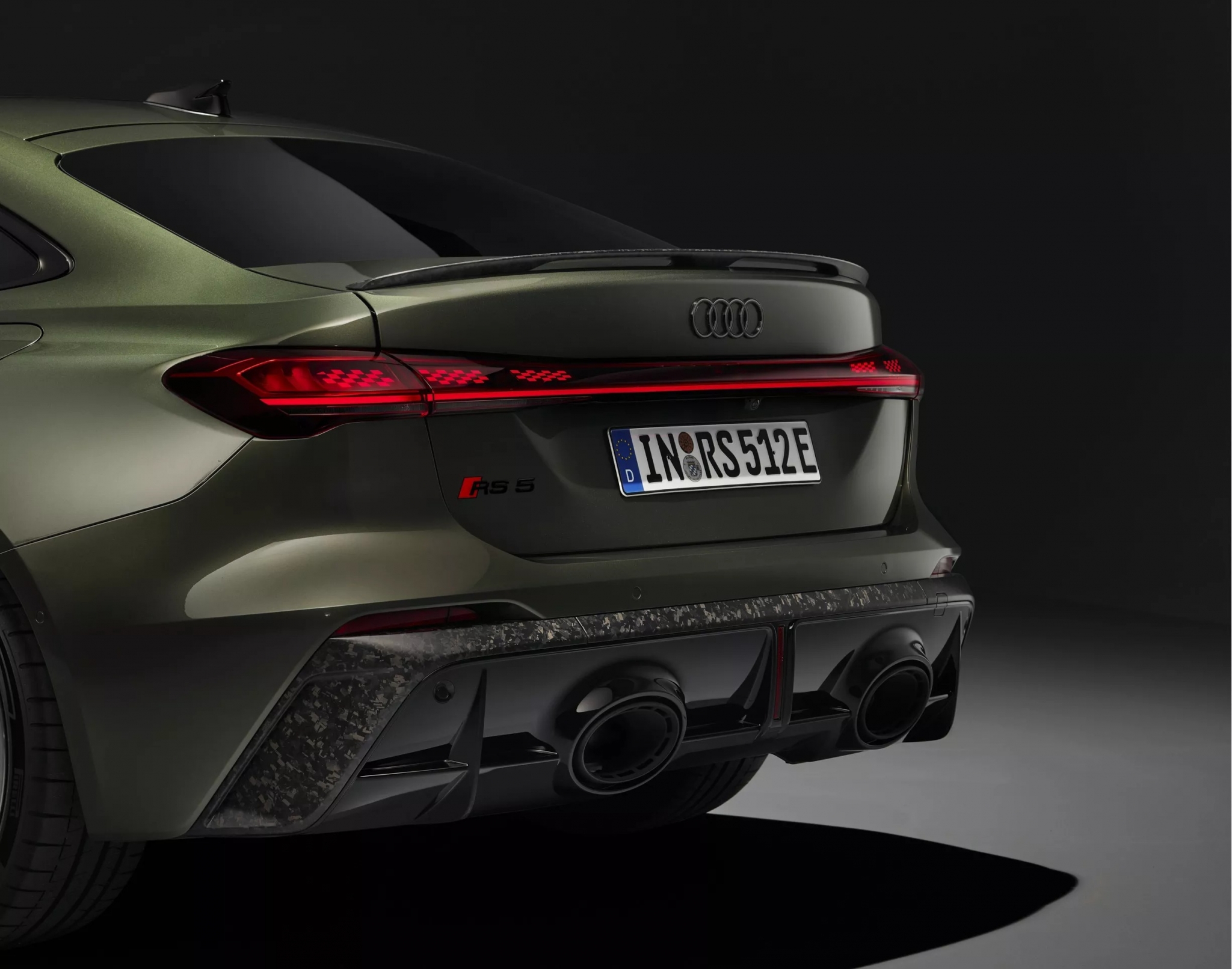 Внешне новый RS5 стал заметно агрессивнее. Кузов примерно на 90 мм шире стандартного A5, передняя часть получила более тёмное оформление и решётку радиатора с ячеистым рисунком, а световые подписи фар украшены графикой в стиле клетчатого флага.