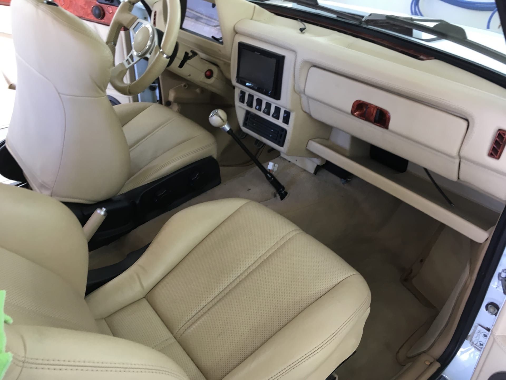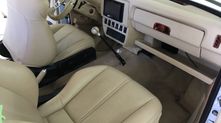 Салон выполнен в белом цвете и практически полностью обшит натуральной кожей. Из нестандартных элементов в глаза бросается новый руль, другая комбинация приборов, экраны в подголовниках передних кресел, а также мощная музыка.