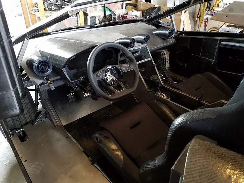 Конечно, весь автомобиль не может быть полностью напечатан. Часть деталей интерьера, которые требовали дополнительной прочности, были сделаны из углеродного волокна. Другие детали изготовили на станках с ЧПУ, используя фрезу и токарный станок на работе у Бэкуса, наряду с гидроабразивной резкой для изготовления петель и деталей подвески. Рама, подвеска и трансмиссия автомобиля также выполнены из стали.