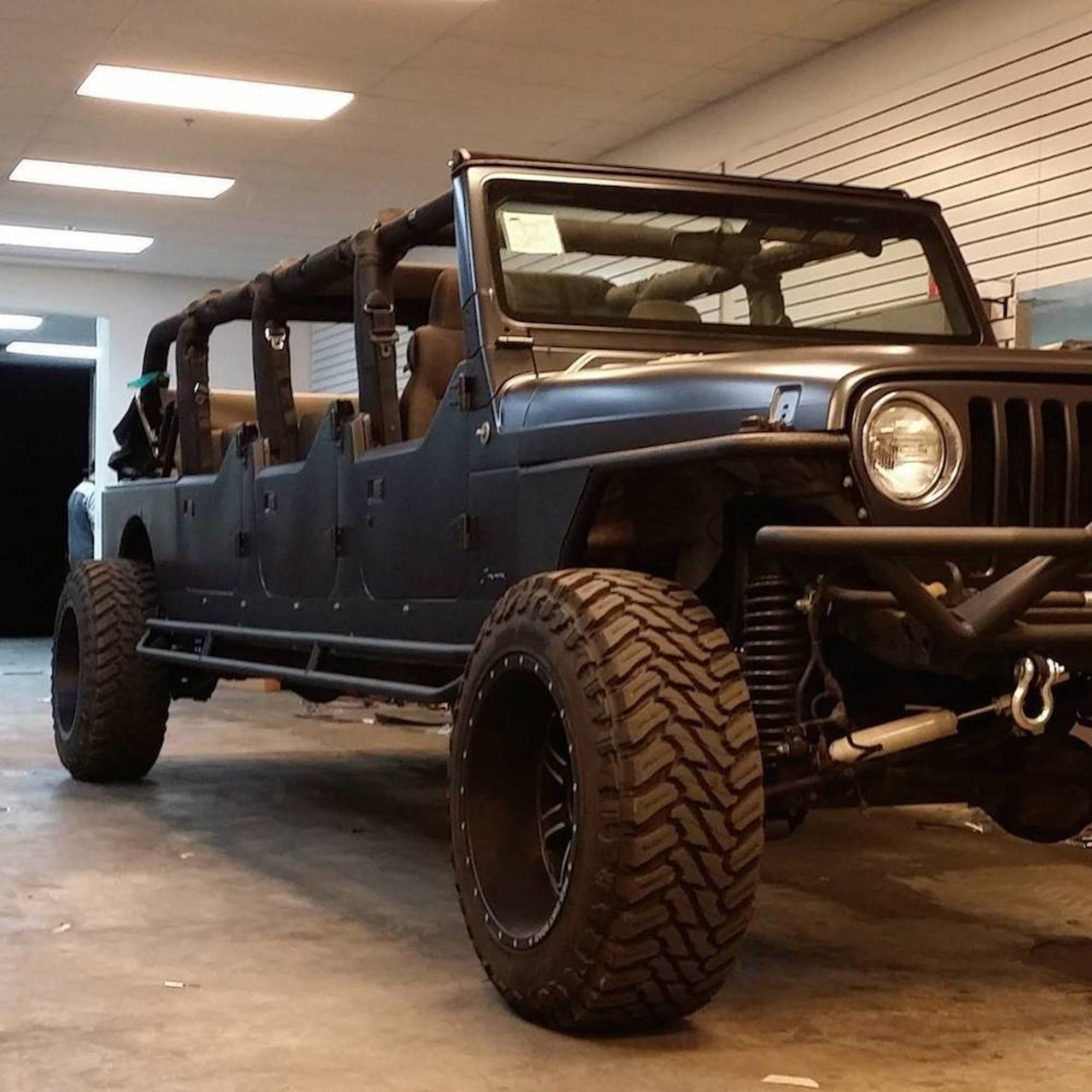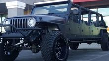 Этот Wrangler легко можно использовать как автобус благодаря трём рядам сидений, на двух из которых установлены диваны. Однако по всем остальным параметрам автомобиль был доработан как типичный внедорожник, с лифтованной подвеской, буксировочными крюками, каркасом безопасности и многими другими деталями. Однако теперь он стал длиннее примерно на 1,5 метра. Единственное, чего не хватает, - холодильника с пивом, но так как его могла увидеть полиция, то хорошо, что его нет.