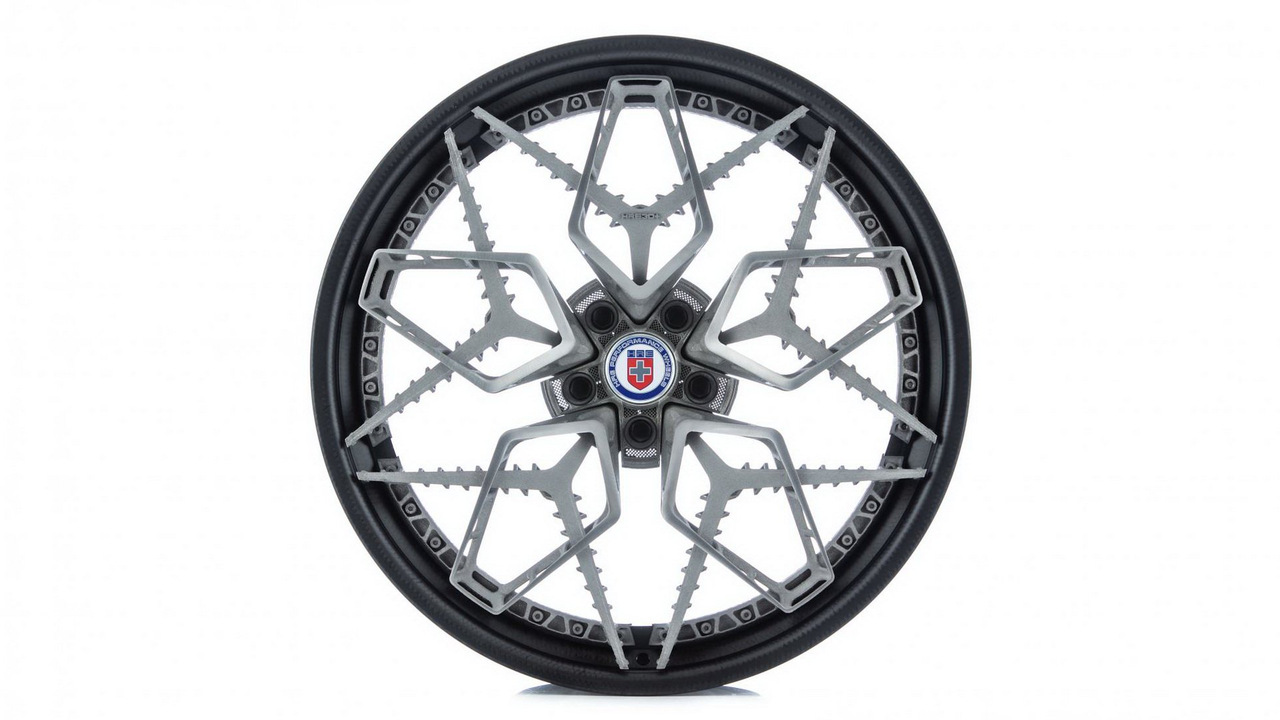 Новое концептуальное колесо HRE3D+ состоит из пяти отдельных элементов, которые затем были объединены с центральной секцией и закреплены титановым крепежом к ободу из углеродного волокна. А дизайн — это нечто. Спицы колесного диска настолько сильно переплетаются между собой, что создает сложнейшую структуру.
