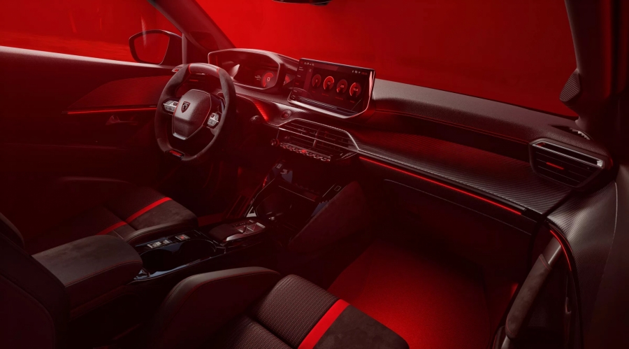 В салоне привет из прошлого продолжается: красная подсветка, коврики, красные ремни безопасности, прострочка на торпедо и спортивных сиденьях с красной центральной полосой — намёки на дизайн классического 205 GTi 1.9. Кроме того, есть узор «с сеточкой», как в тканевой версии 1.6.