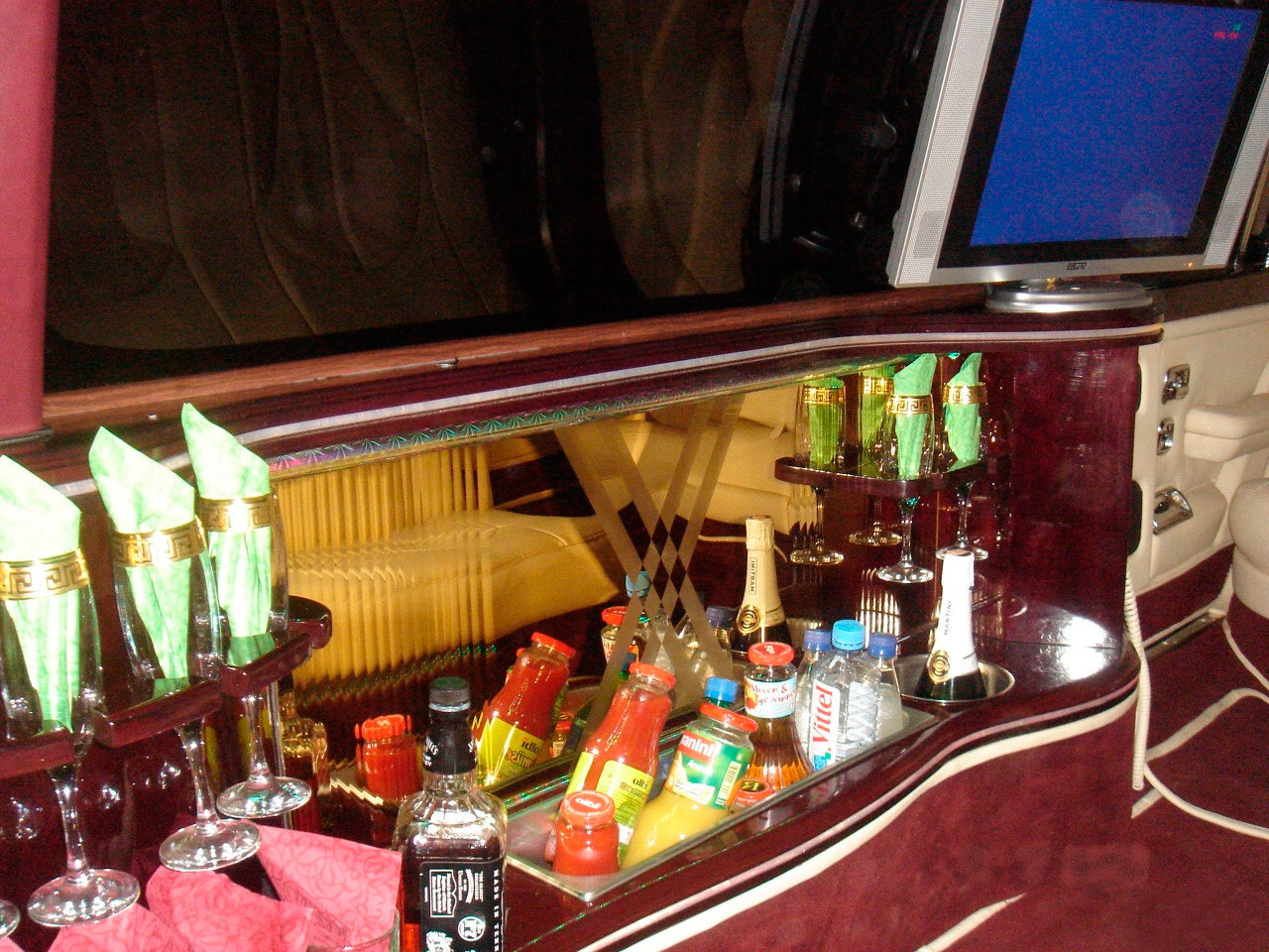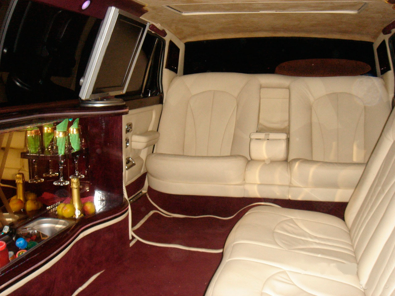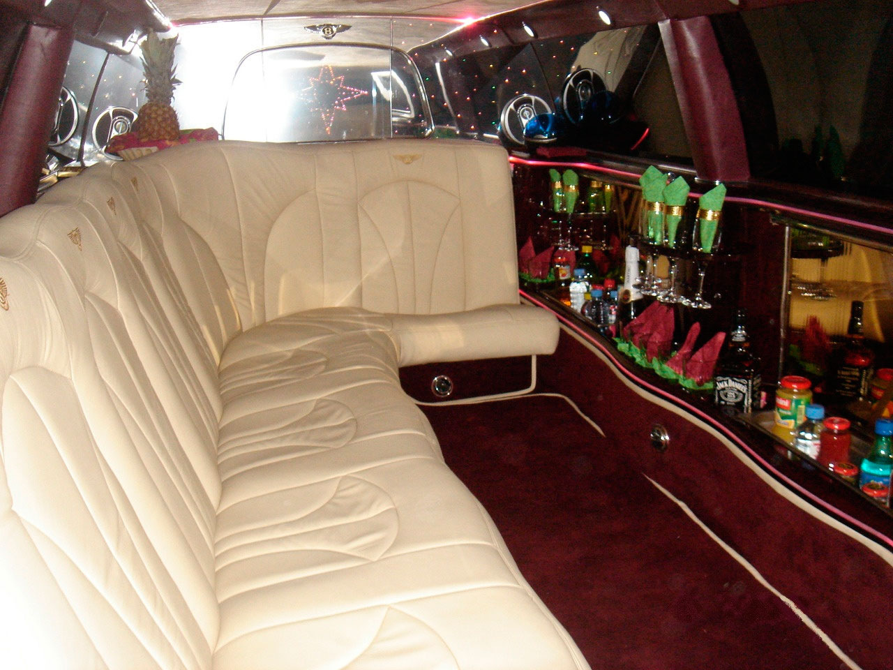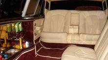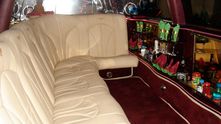 Салон совершенно типичен для лимузинов. В задней части находится комфортабельный двухместный диван, а по левому борту разместился Г-образный диван, напротив которого бар с напитками. 9-метровый лимузин рассчитан на 8 пассажиров.
