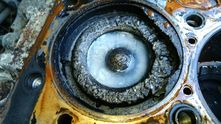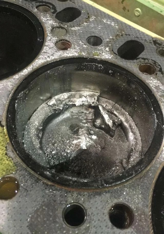 Перед вами один из поршней 6.7-литрового дизеля Cummins, который стоит на грузовике Peterbilt. Внезапно из выхлопных труб повалил белый дым. Механики сняли головку блока цилиндров и обнаружили поршень и клапана, приплавившиеся к стенкам. Жуткое зрелище.