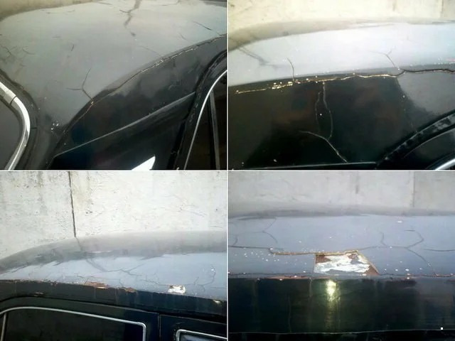 Узнали знакомые обводы автомобиля "Волга"? Автомобиль побывал в ДТП, получив повреждение крыши. Во время кузовного ремонта выправлять её никто особо не стал, наложим толстый слой шпаклевки. Со временем она начала трескаться, превратившись в то, что вы видите на фотографиях.