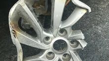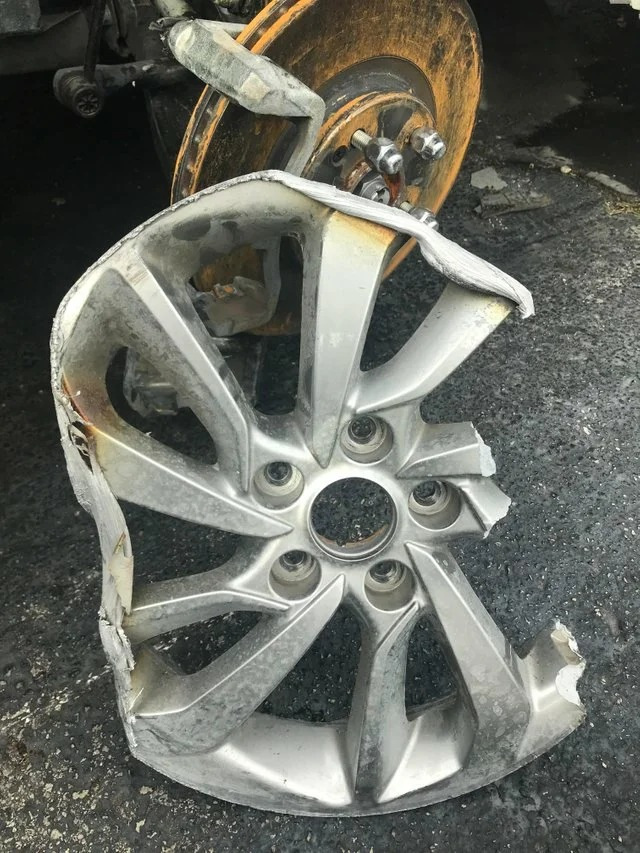 Клиент, обратившийся в сервисный центр, рассказал, что он врезался в бордюр на парковке ТЦ Wallmart. Вы вообще видели когда-нибудь подобные разрушения колесных дисков? Как нужно въехать в бордюрный камень, чтобы полностью уничтожить литое колесо?