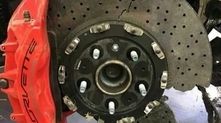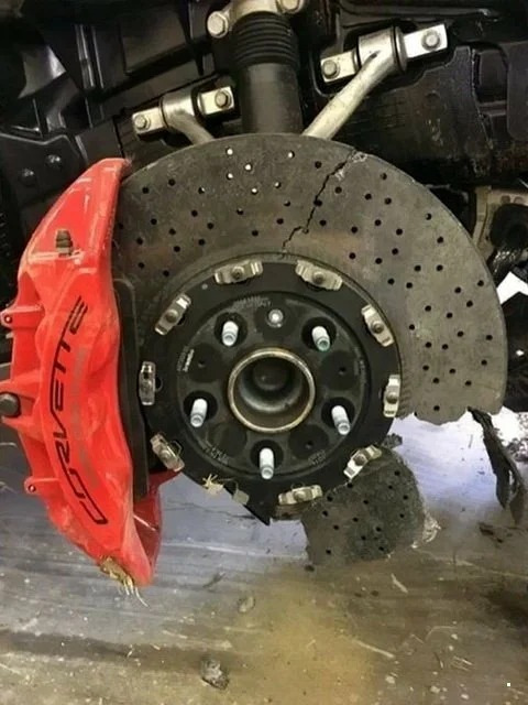 По надписи на переднем суппорте вы уже поняли, что это Chevrolet Corvette. После аварии или наезда на препятствие левым передним колесом керамический диск рассыпался на множество осколков. Жалко, больно, дорого...