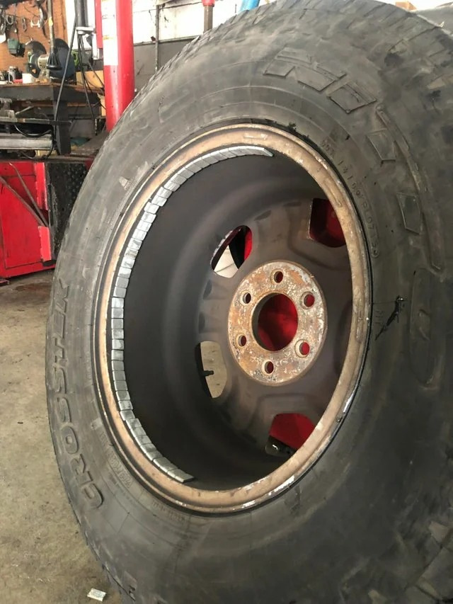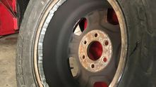 Посмотрите на количество грузиков, которые использовали на шиномонтаже, чтобы отбалансировать колесо. Длинная лента свинца размещена лишь с одной стороны колесного диска, что может означать лишь одно: колесо сильно деформировано с противоположной стороны. Стоило взять кувалду и попробовать немного исправить геометрию.