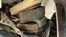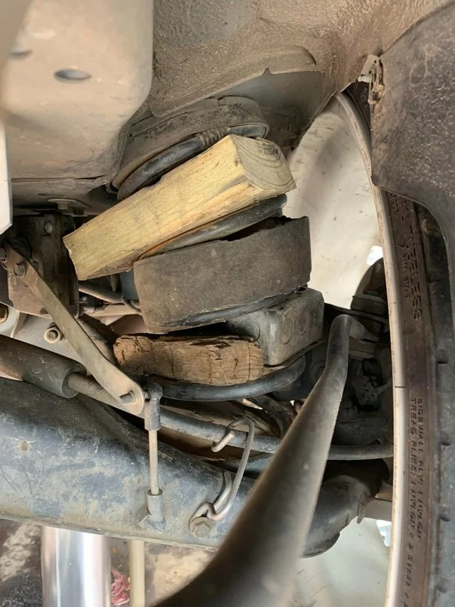Один из владельцев Cadillac DeVille приехал в сервисный центр с подобным состоянием передней подвески. Он куда-то дел часть амортизатора, а значит ему пришлось как-то фиксировать положение кузова. Он использовал хлам, который нашел у себя в гараже, чтобы вставить его между витками пружины.