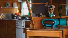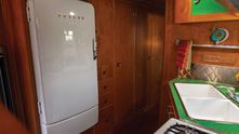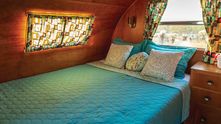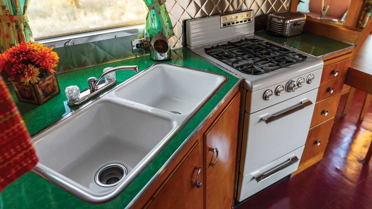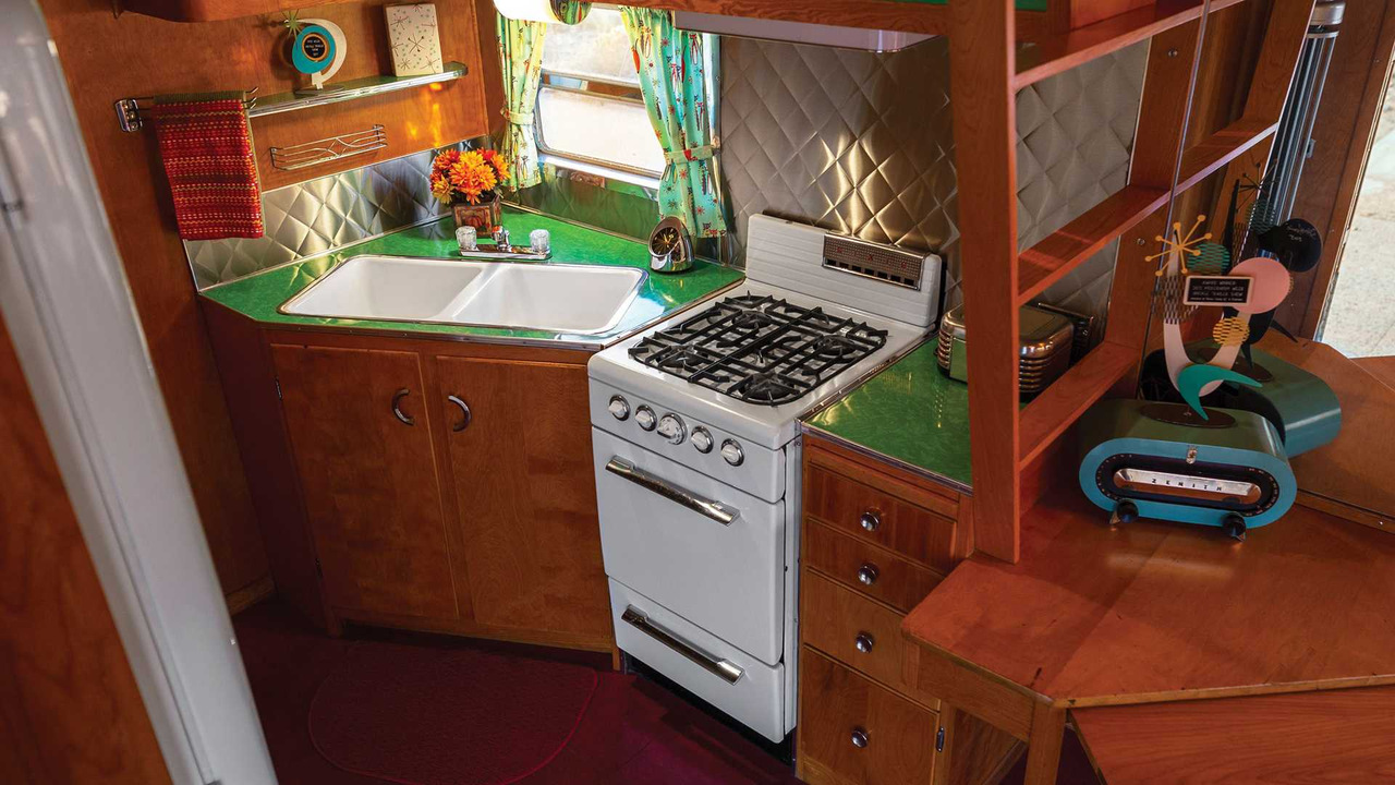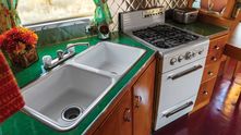 Хотя Spartan Spartanette Tandem 131 уже более 50 лет, он поставляется со всем, что вы найдете в современном прицепе для кемперов. Огромная кровать и раскладной диван рассчитаны на четырех человек. Кемпер оснащен духовкой и плитой Dixie, холодильником Philco, водонагревателем, отопителем, кондиционером и достаточным местом для хранения вещей. Там также есть ванная комната с раковиной, туалетом и душем.