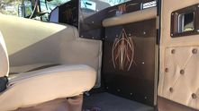 Спальный отсек представляет собой огромную двуспальную кровать. Стены и потолок отделаны драпированной кожей. Сверху - ящики для мелочей и динамики аудиосистемы.