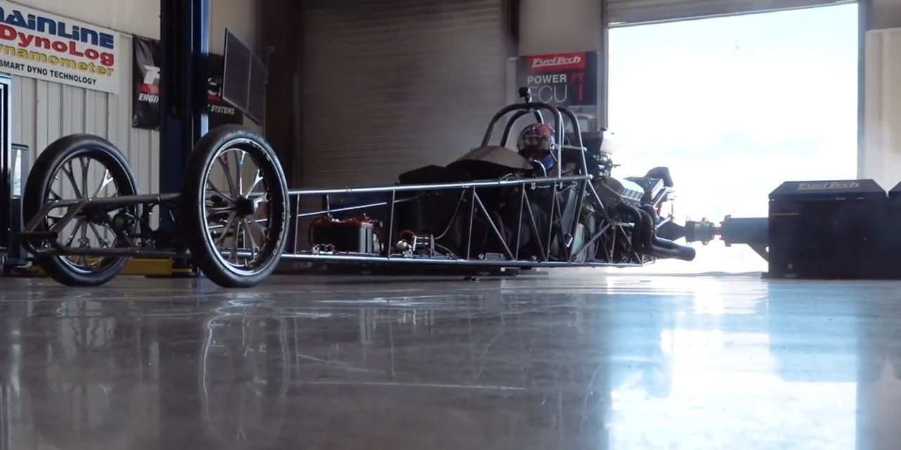 Тесты драгстеров на динамометре проходят в несколько ином режиме. Он имитирует дрэговый заезд. Вы услышите, как ревут двигатели и переключаются коробки передач, когда водители бьют газ.