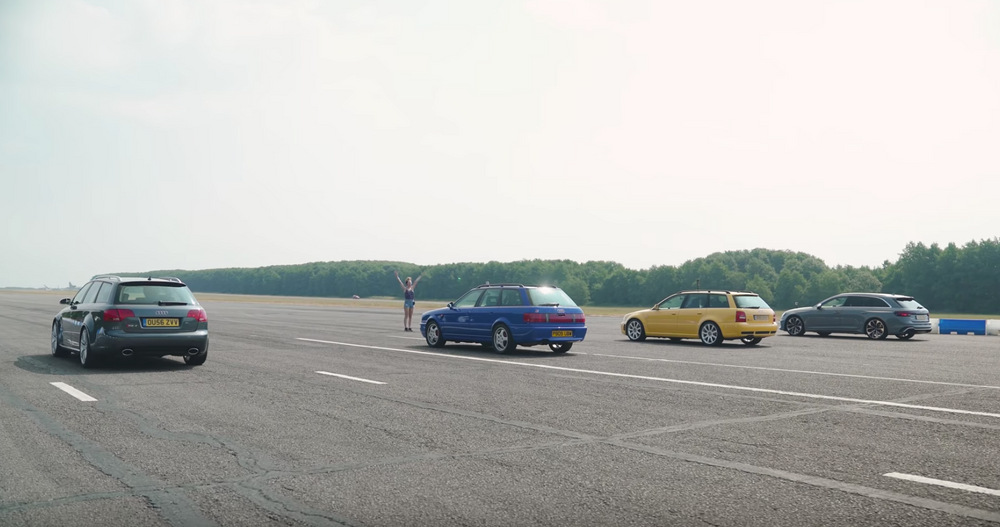 Было проведено сразу несколько заездов с места и в движении. Результаты довольно предсказуемые. Самым быстрым на четверти мили оказался Audi RS4 B9, который проехал дистанцию за 12,1 секунды, а самым медленным — Audi RS2 с результатом 16,8 секунды. При этом поколения B5 и B7 показали очень похожее время: первый проделал это за 14,1 секунды, второй — за 14,0 секунды.