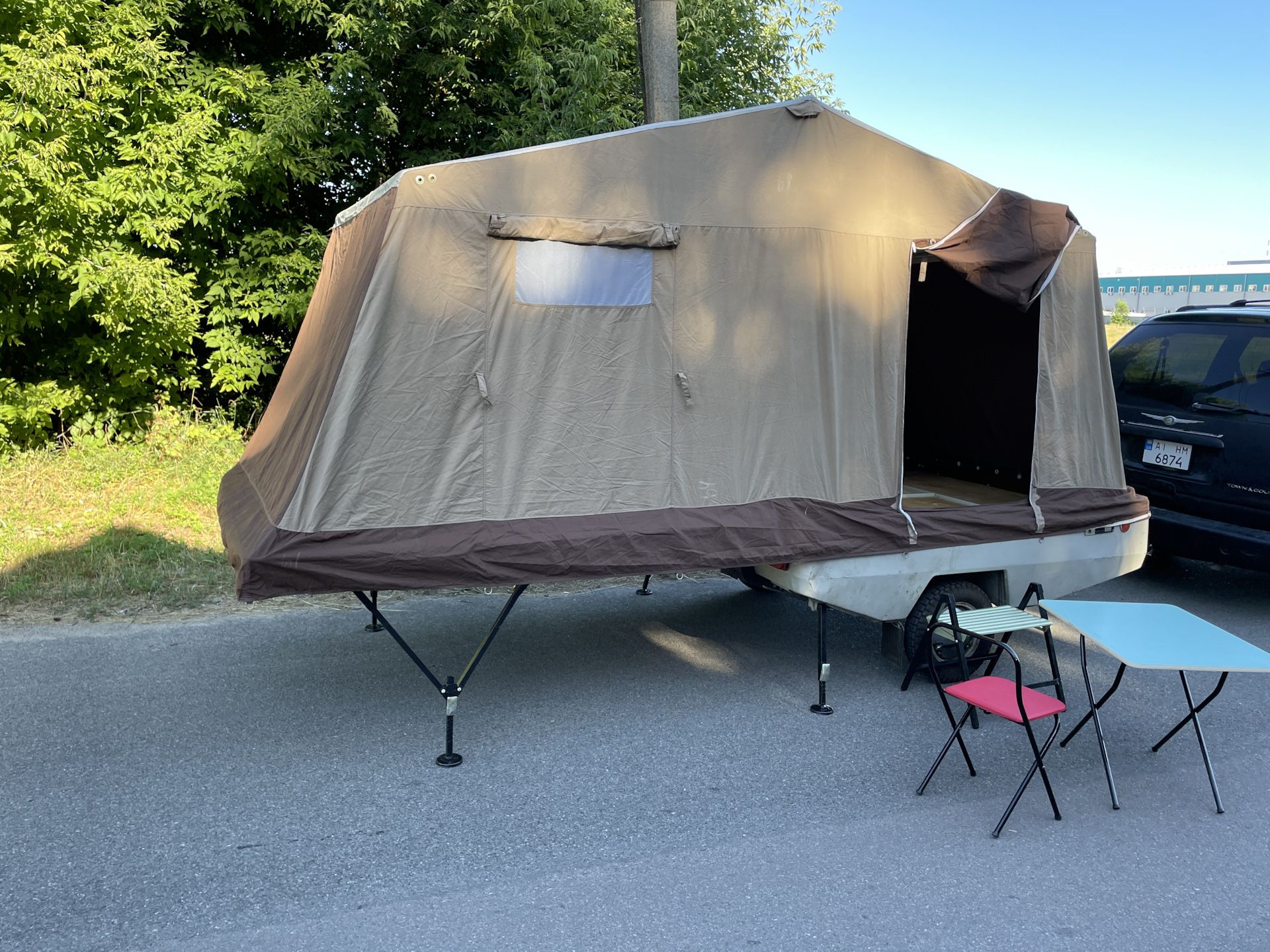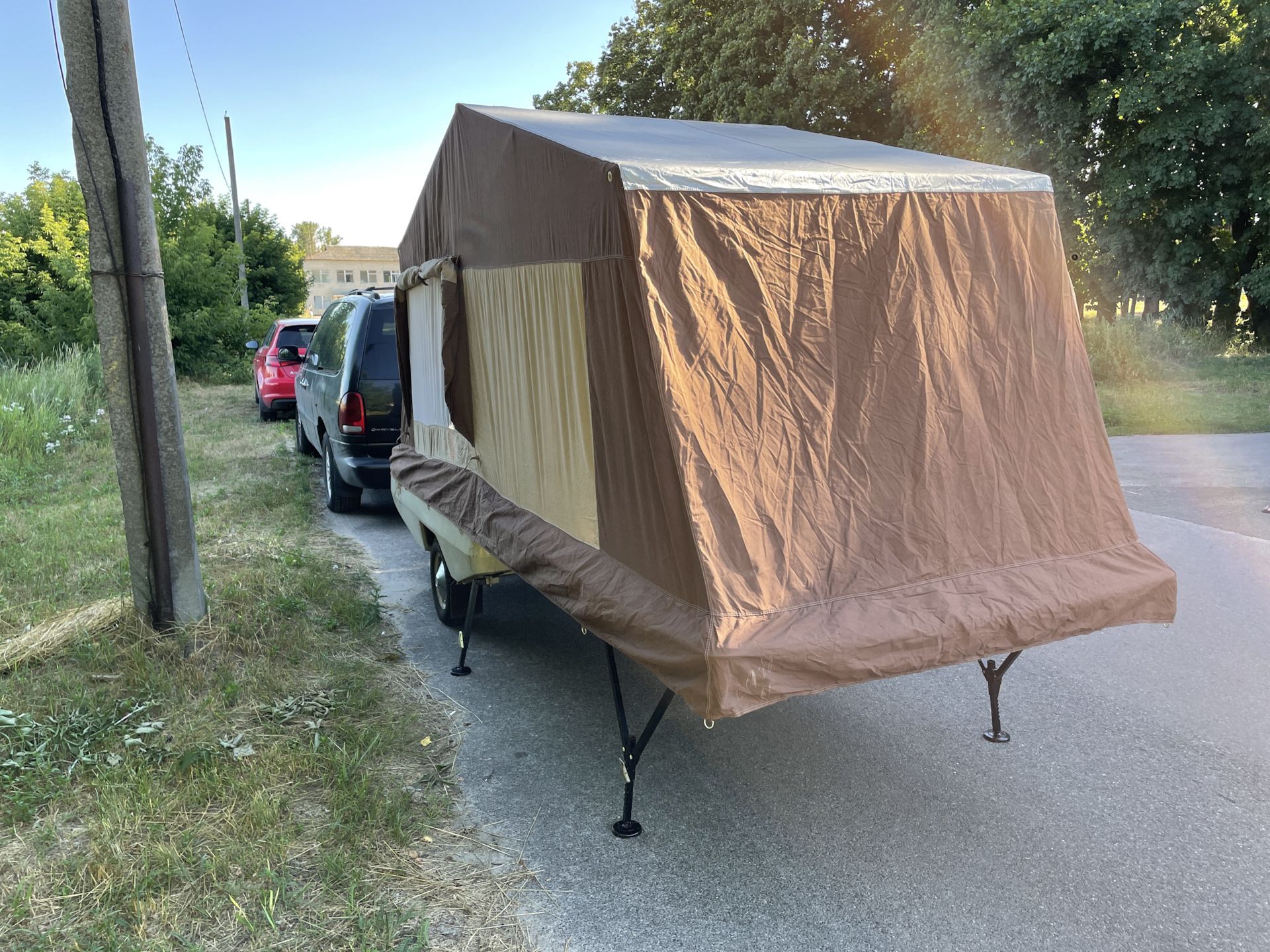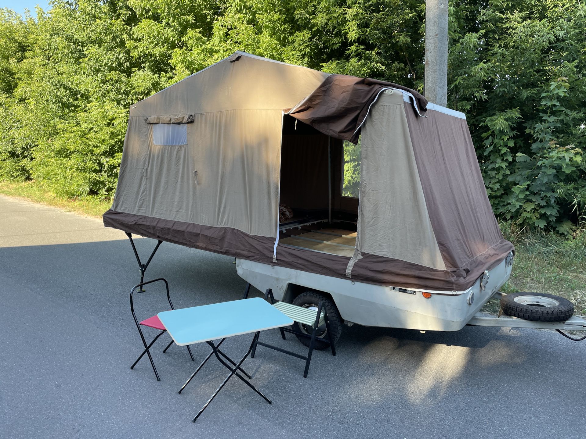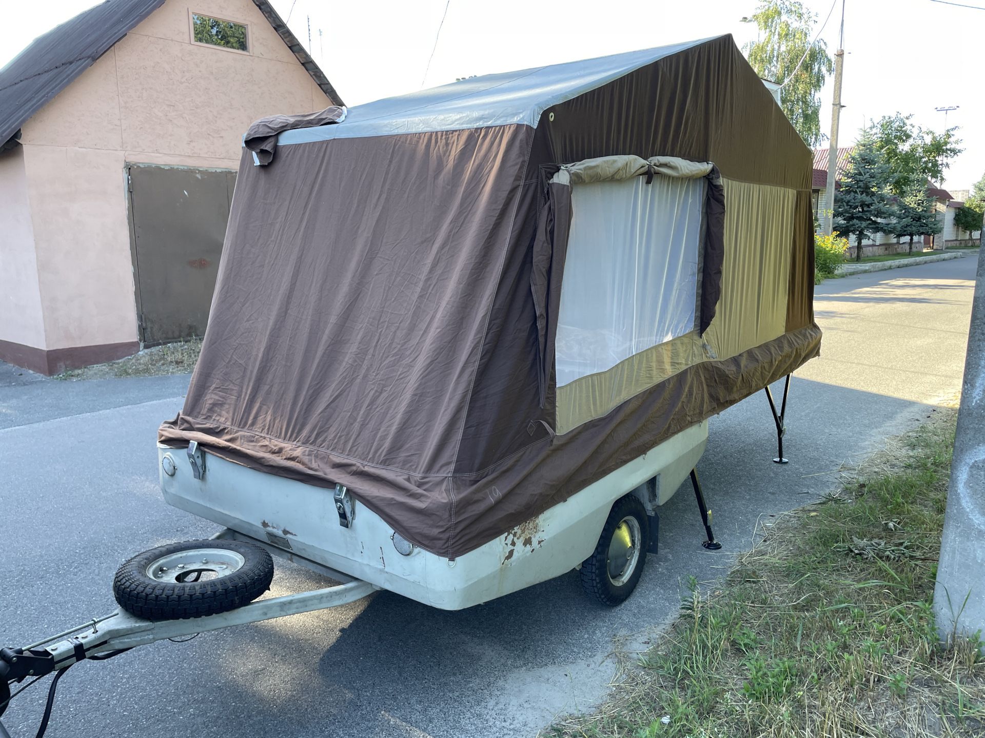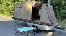 Примечательно, что в разложенном виде прицеп увеличивается в размерах в пять (а то и больше) раз. Большая часть палатки держится при помощи алюминиевых стоек — подпорных домкратов. При этом конструкция более чем надежная и устойчивая.