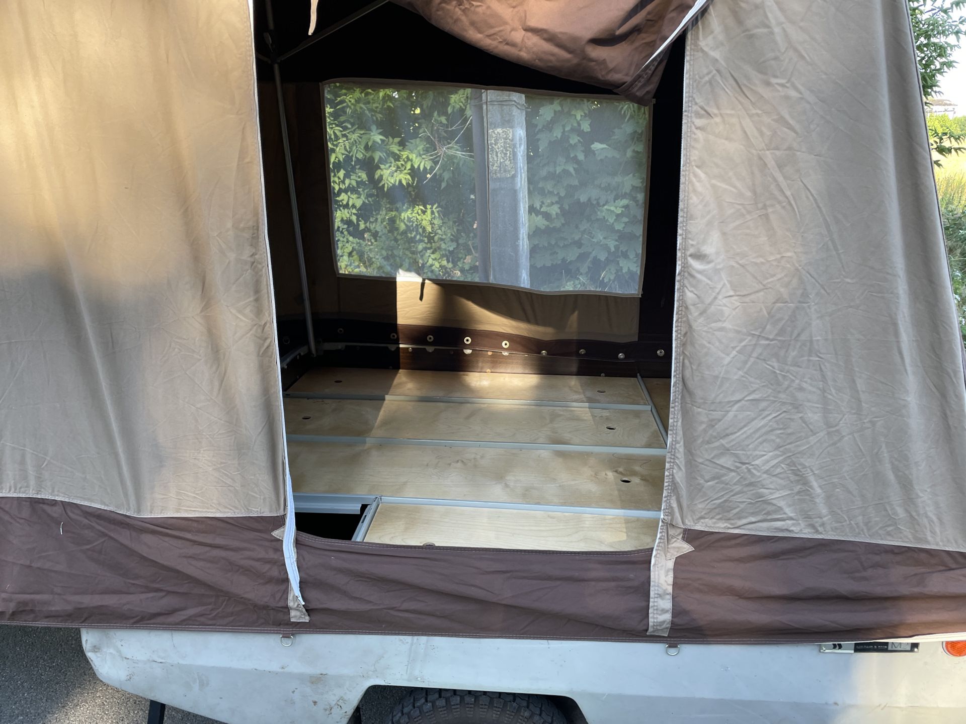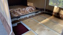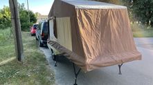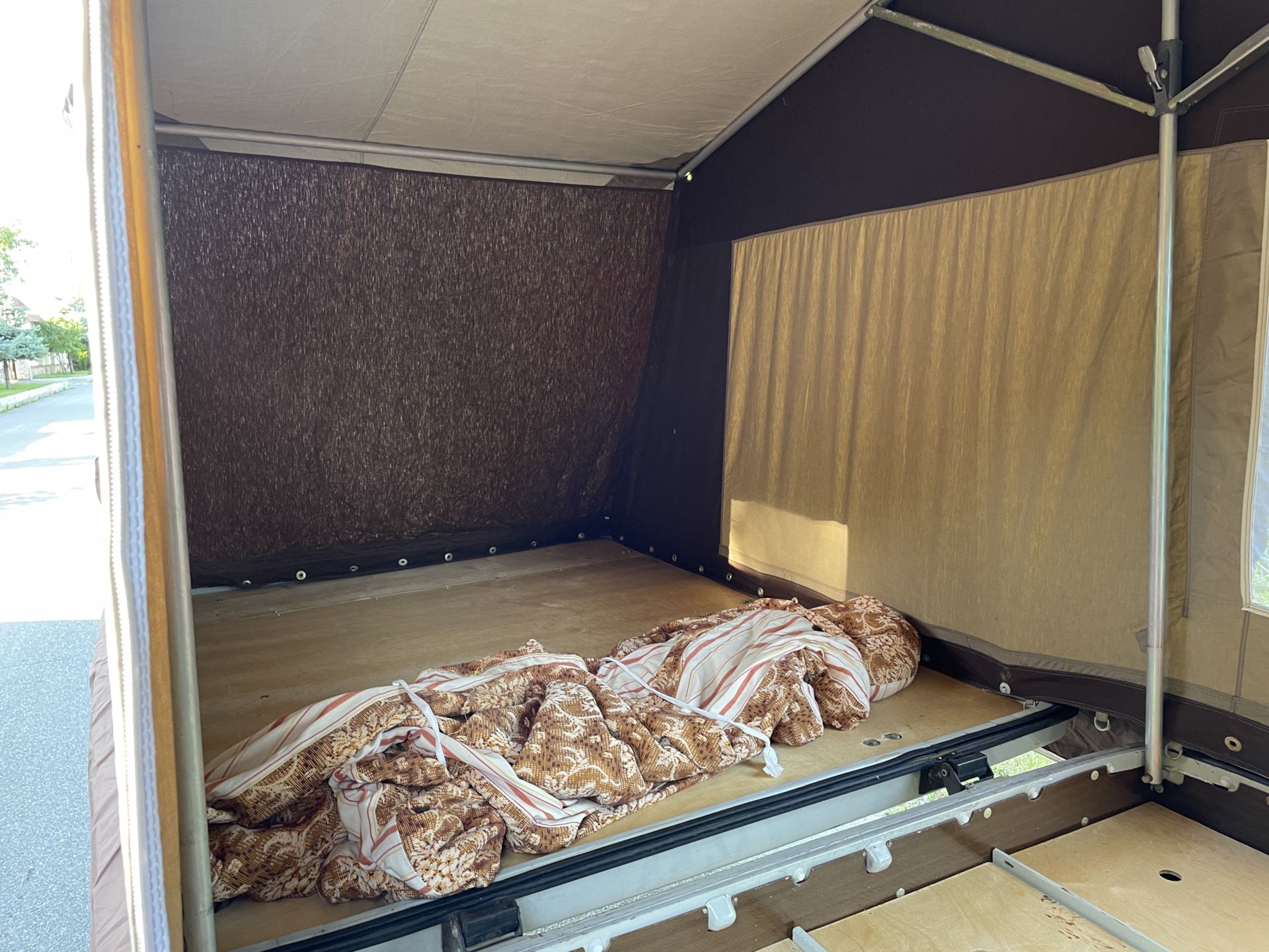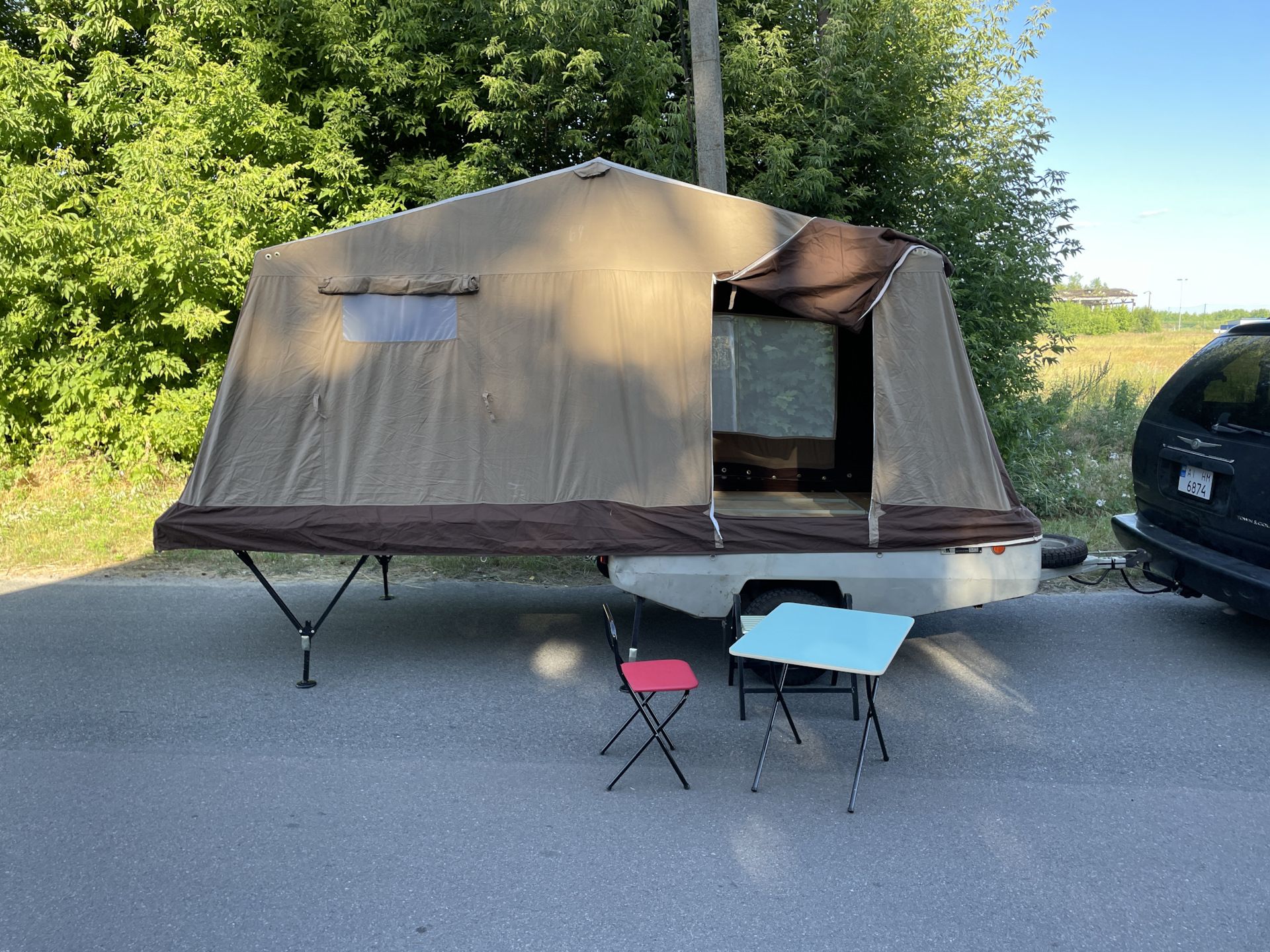 Примечательно, что в разложенном виде прицеп увеличивается в размерах в пять (а то и больше) раз. Большая часть палатки держится при помощи алюминиевых стоек — подпорных домкратов. При этом конструкция более чем надежная и устойчивая.