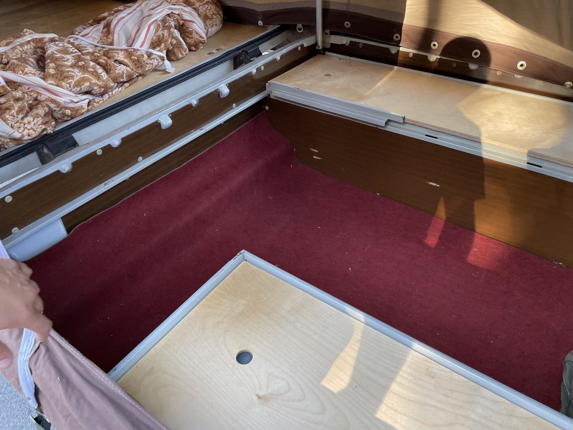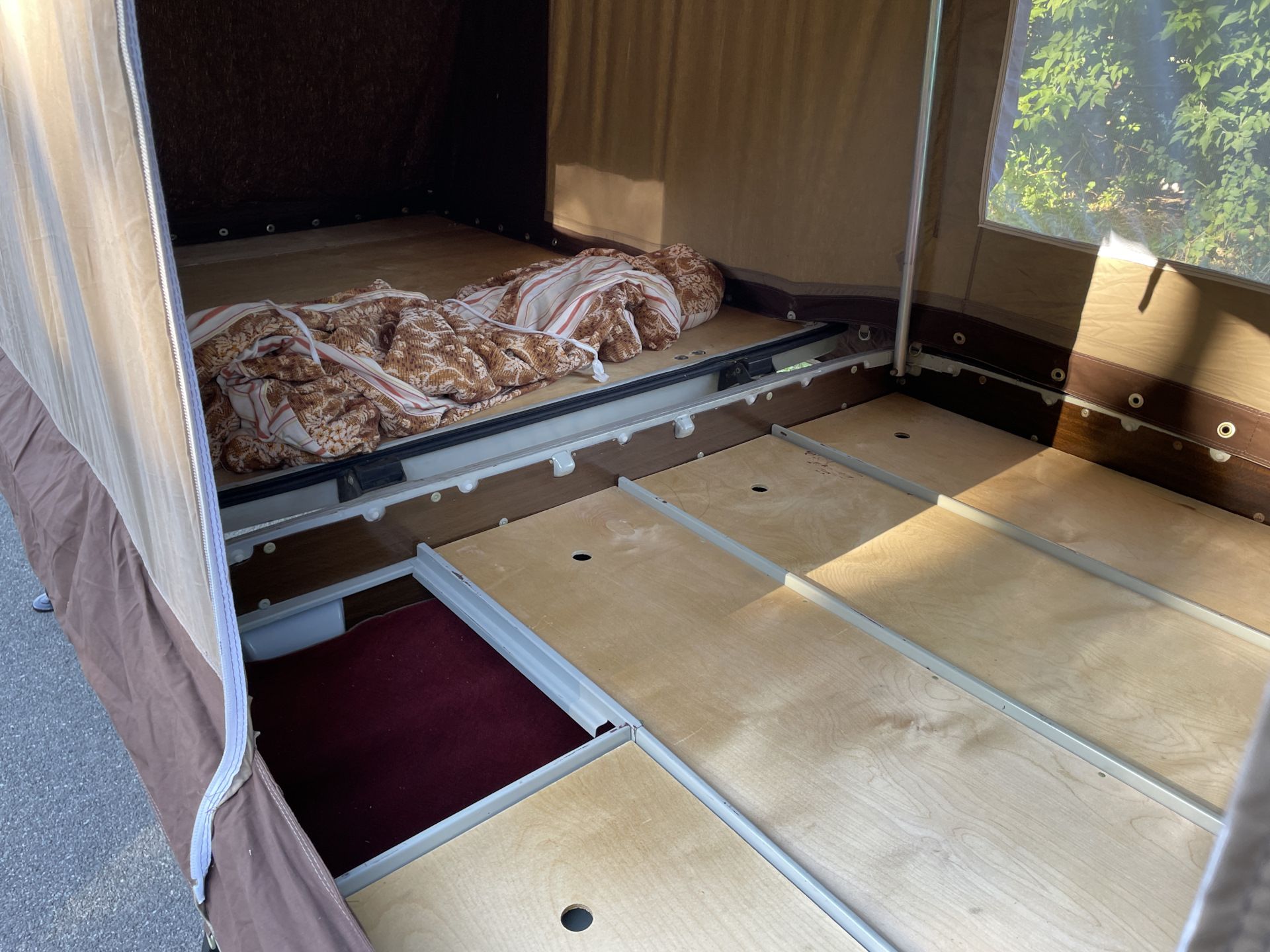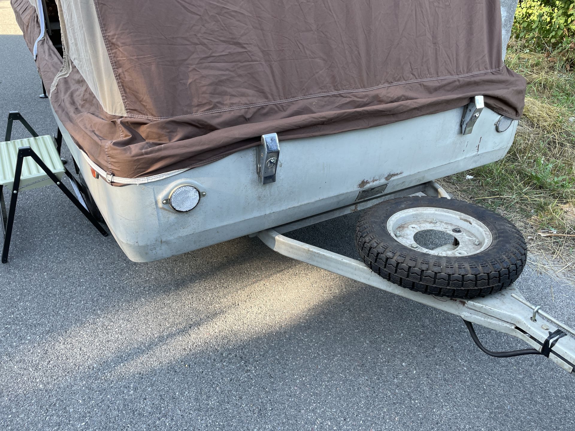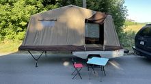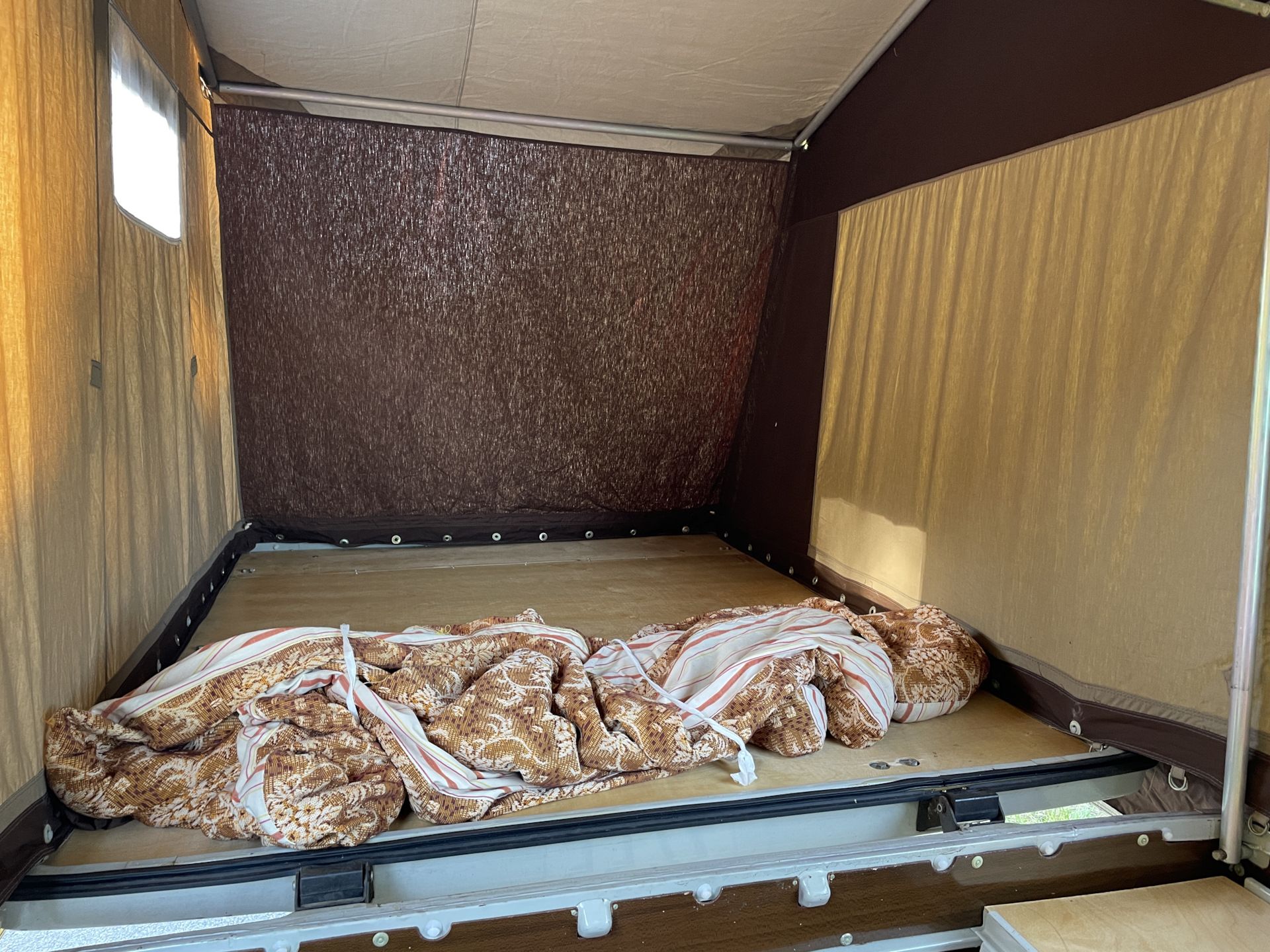 Примечательно, что в разложенном виде прицеп увеличивается в размерах в пять (а то и больше) раз. Большая часть палатки держится при помощи алюминиевых стоек — подпорных домкратов. При этом конструкция более чем надежная и устойчивая.
