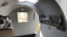 Прицеп длиной 4 метра имеет две двери, причем самая большая расположена сзади и открывается, чтобы можно было обедать на свежем воздухе. В передней части есть люк и большое окно, через которые проникает много естественного света и столь необходимый ветерок.