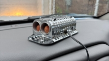 Принцип использования устройства понятен уже по фотографиям. Аппарат размером и формой напоминает строительный пистолет для герметика и установлен на открытой крышке бардачка, что выглядит довольно рискованно. Водитель выдвигает держатель для сосиски, помещает её внутрь электрически нагреваемой трубки — и процесс начинается.