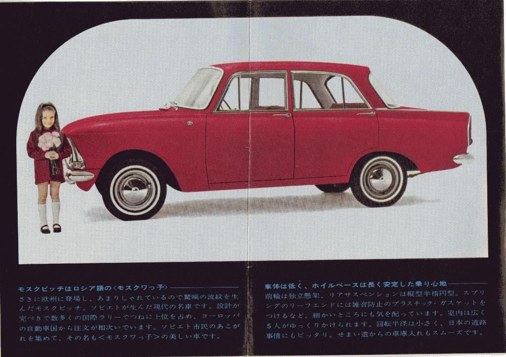 Интересно, что в брошюре изображен четырехглазый Москвич-408 (видимо в варианте Elite) с левым расположением руля. Именно такие варианты, а не адаптированные под левостороннее движение, отправили в Японию.