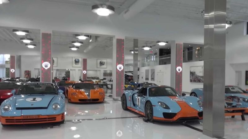 Видеоблогер начинает с комнаты, где стоят очень дорогие гиперкары. На поворотном столе находится новый Apollo IE. Прямо перед ним — три поколения суперкаров Porsche, все в ливреях Gulf, что достаточно, чтобы взволновать любого поклонника марки. Также стоит обратить внимание на Maserati MC12 и McLaren P1.