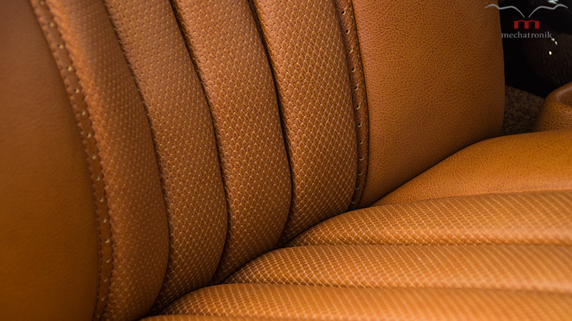 Салон "сверкает" натуральной кожей коньячного цвета и вставками из натурального дерева на передней панели.