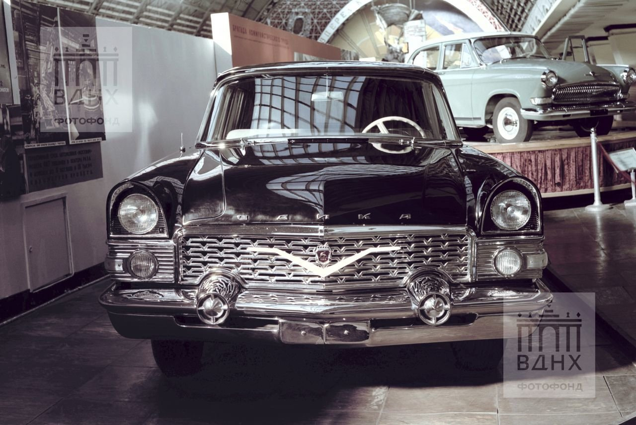 Еще один представительский лимузин, в том виде, в котором мы его привыкли видеть — ГАЗ-13 "Чайка" с кузовом черного цвета и обилием хрома. Выпуск этой модели стартовал в 1959 году и продолжался до 1981 года. Оснащался 5,5-литровым бензиновым двигателем мощностью 195 л.с., который мог разогнать тяжелый лимузин до 160 км/ч. Эта фотография — прекрасная возможность увидеть, как "Чайка" выглядела в оригинальном состоянии.