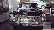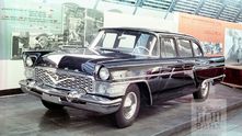 Начнем с представительского лимузина ЗИЛ-111 образца 1959 года. Он предстал в довольно интересной двухцветной окраске кузова со светлым низом и темным верхом. Обычно все лимузины окрашивались исключительно в черный цвет. Под капотом находился 200-сильный бензиновый V8 рабочим объемом 5969 кубических сантиметров.