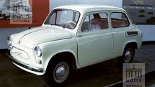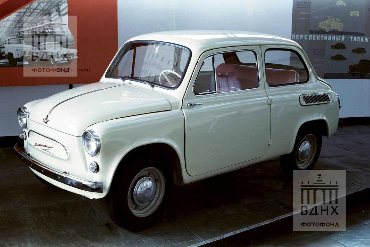 Следующий автомобиль всем прекрасно известен. Это ЗАЗ-965А "Запорожец" образца 1960 года. Выпуск этих малолитражек только стартовал в это время. Крохотные автомобильчики рекламировались как "перспективный типаж". Обратите внимание на плакат, висящий на стене за автомобилем.