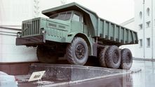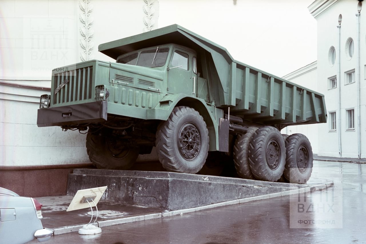 Самые большие экспонаты невозможно было впихнуть в узкие проезды павильона ВДНХ, поэтому их оставили снаружи. Перед вами один из самых больших самосвалов в СССР — трехосный МАЗ-530 образца 1957 года. Его грузоподъемность составляла 30 тонн, но конструкцию признали не самой удачной. У него было очень большой радиус разворота, а его 450-сильный дизельный двигатель расходовал до 200 литров солярки на 100 км.