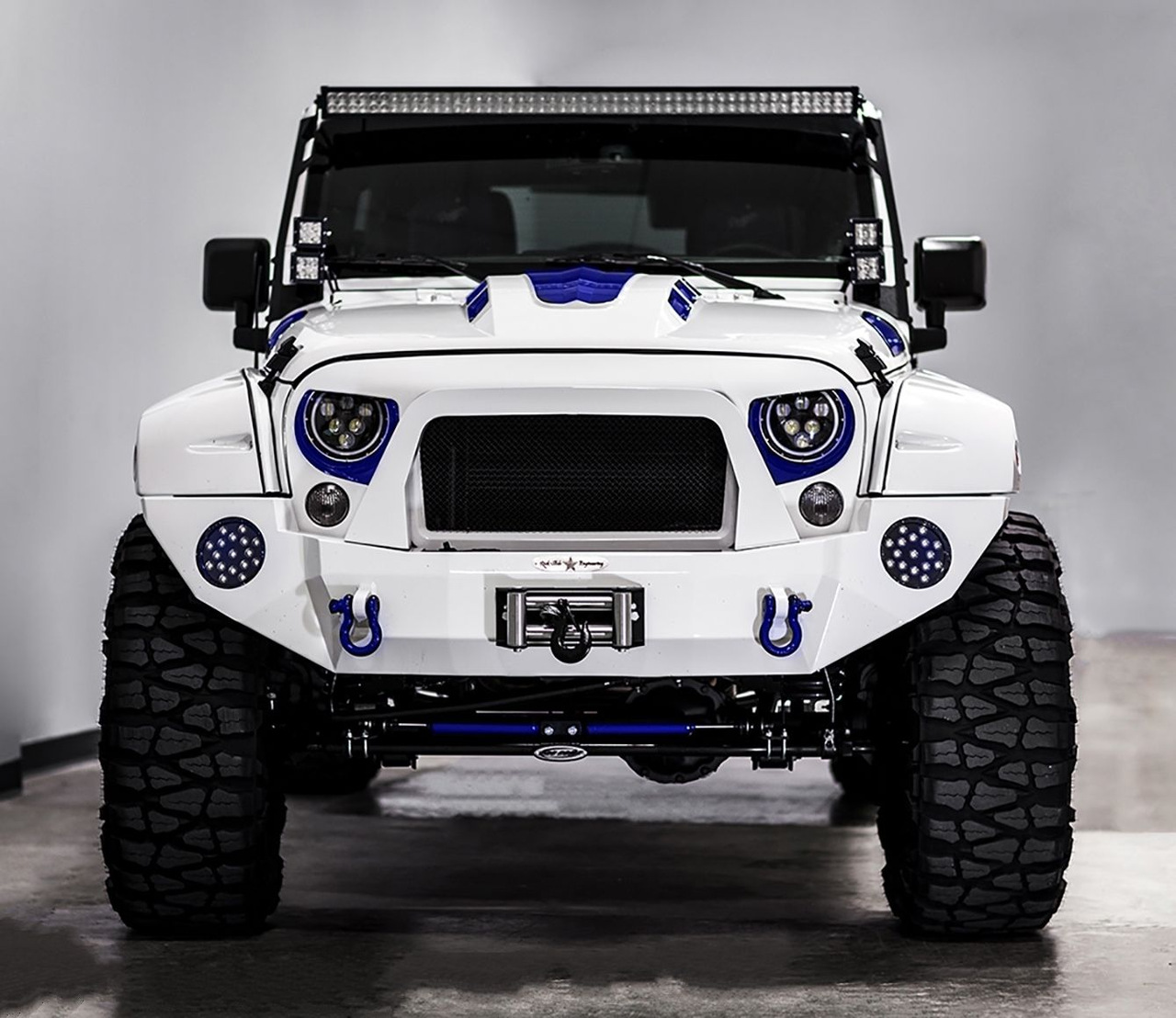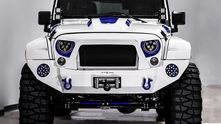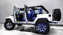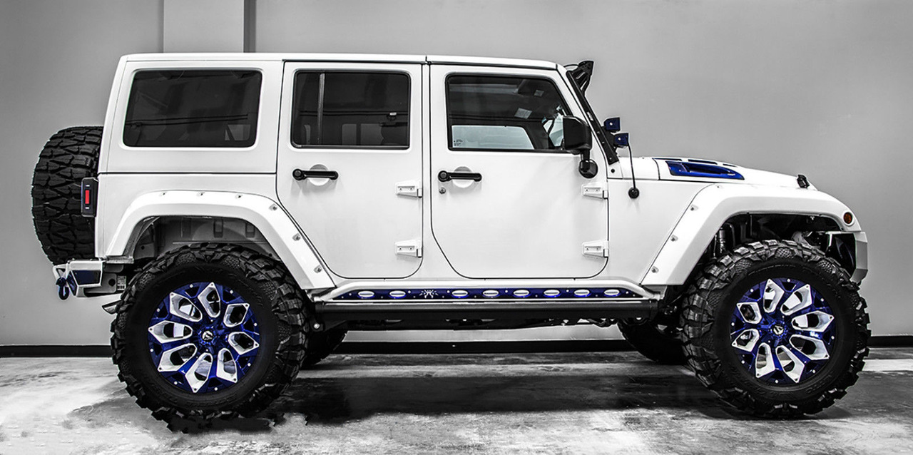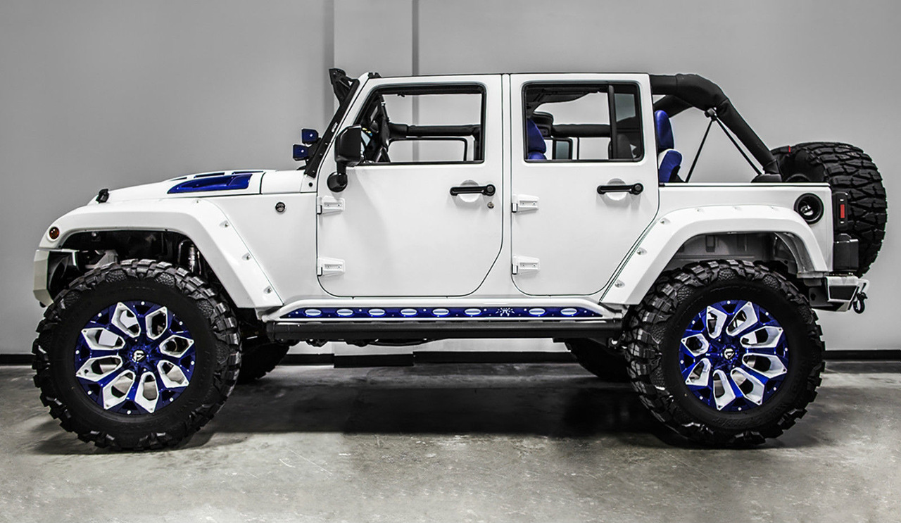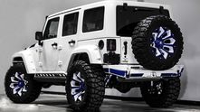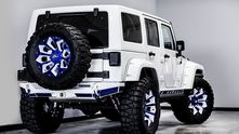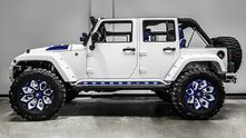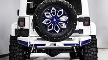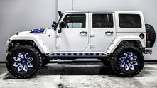Внешне данный Wrangler был "одет" в прекрасный обвес, который включает в себя увеличенный передний и задний свесы, капот с большим горбом, колёса, выкрашенные в сочетание синего и белого, а также комплект внедорожных покрышек.