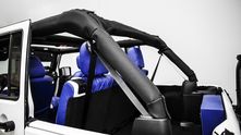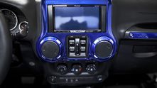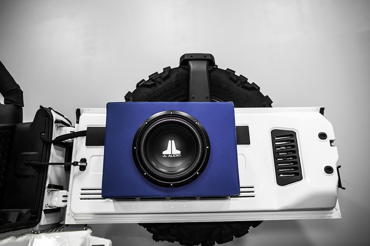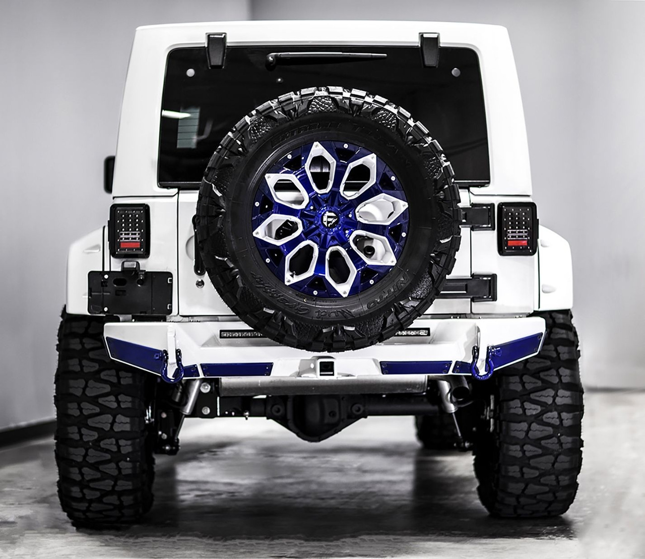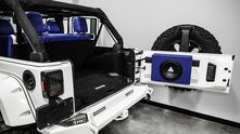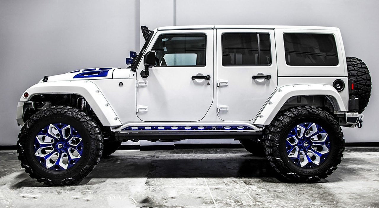 Внешне данный Wrangler был "одет" в прекрасный обвес, который включает в себя увеличенный передний и задний свесы, капот с большим горбом, колёса, выкрашенные в сочетание синего и белого, а также комплект внедорожных покрышек.