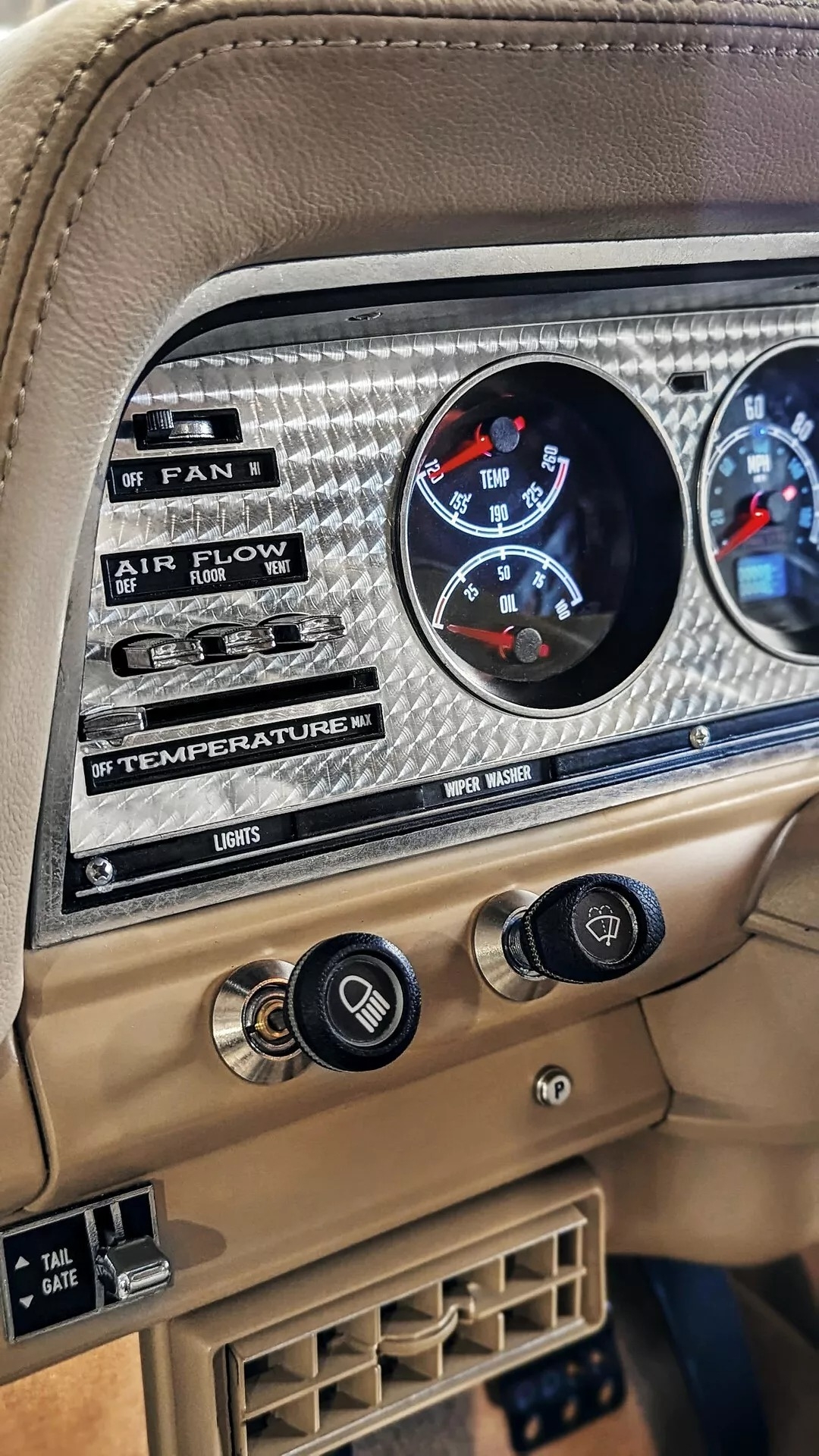Сиденья и дверные панели отделаны коричневой кожей Moore & Giles с тисненым цветочным узором. Внедорожник также оснащен системой климат-контроля Vintage Air Magnum V и оригинальным радио AM/FM/CB.