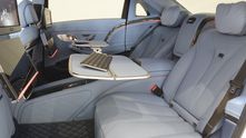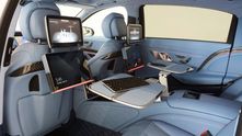 Ещё Brabus известны тем, что делают офисы на колёсах из длиннобазных моделей Mercedes-Benz. Такой подход прослеживается и в салоне этого автомобиля, где экранов стало больше, чем хочется иметь. Их можно использовать для того, чтобы следить сразу за всеми новостями, или не использовать вовсе. Также среди других деталей отметим карбон и подсветку подстаканников.