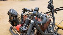 Но самое неожиданное по мотоциклетным меркам — это мотор. Речь идет о старом 2,0-литровом двухцилиндровом тракторном дизеле мощностью 20 лошадиных сил. Фишка агрегата в том, что оба цилиндра работают синхронно — как один единый цилиндр. И эта особенность сказывается на повадках машины, зачастую не лучшим образом. Заводиться двигатель по-особенному. Для начала цилиндры открывают, скидывают компрессию, стартер раскручивает мотор, потом декомпрессор закрывают, компрессия появляется, и агрегат начинает работать.