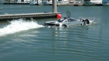 Попадая в воду, передние колеса гидравлически убираются в колесные арки и закрываются двумя алюминиевыми крышками, а массивный передний спойлер поднимается, чтобы прорезать волны.