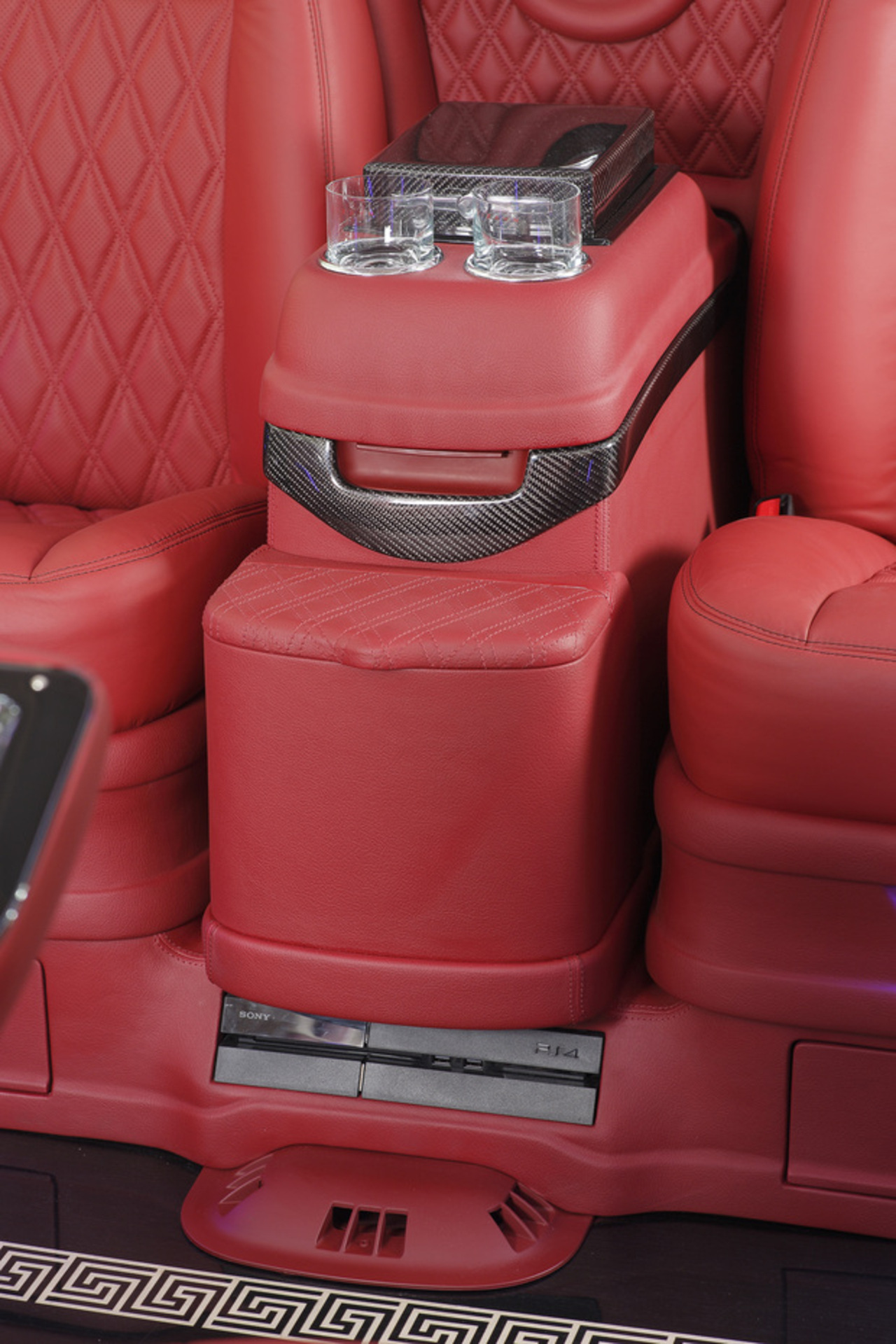 Например, в салоне этого V-Class теперь установлены комфортабельные сиденья от S-Class, оснащённые обогревом и функцией массажа, а также 32-дюймовый телевизор, интегрированный в стенку между кабиной и салоном. Кроме того, предусмотрена функция управления медиа-системой в салоне при помощи iPad, который смонтирован прямо в подлокотник и оснащён программой дистанционного управления KLASSEN Remote Control App.