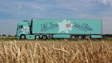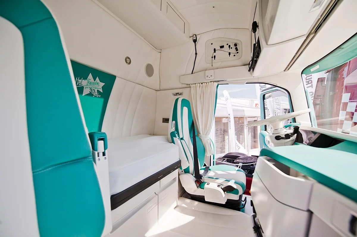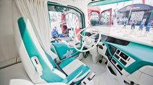 Тягач и полуприцеп окрасили в модный ментоловый цвет, а все хромированные или черные детали стали матово-белыми. Такое сочетание цветов визуально облегчает огромный грузовик.