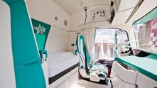 Внутри дизайнеры компании сохранили стилистику внешнего вида, использовав всё то же сочетание ментолового и белого. В такой салон можно залезать только в сменной обуви.