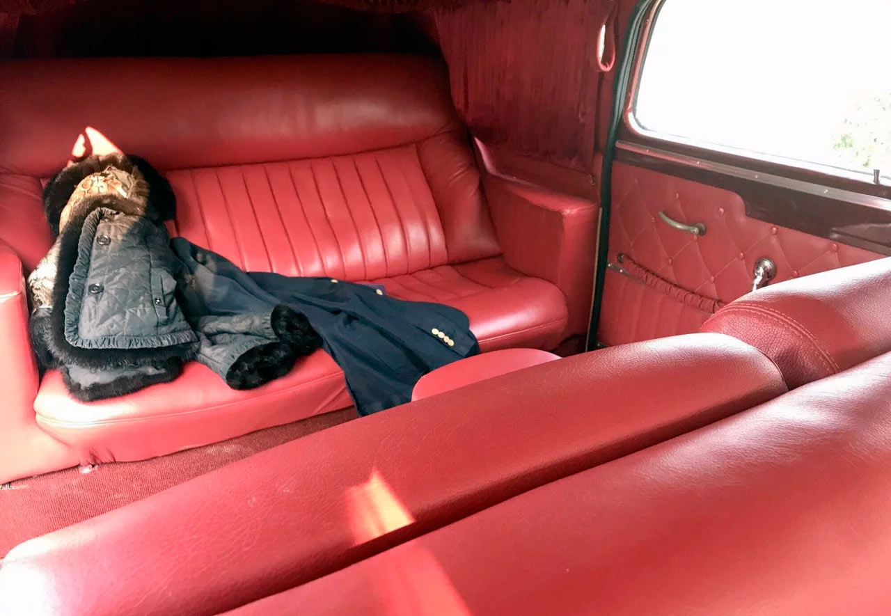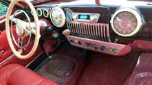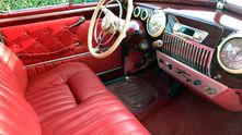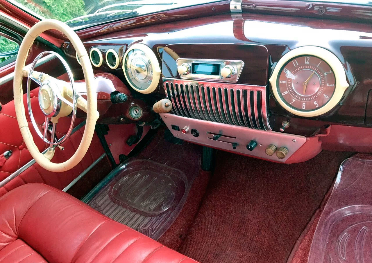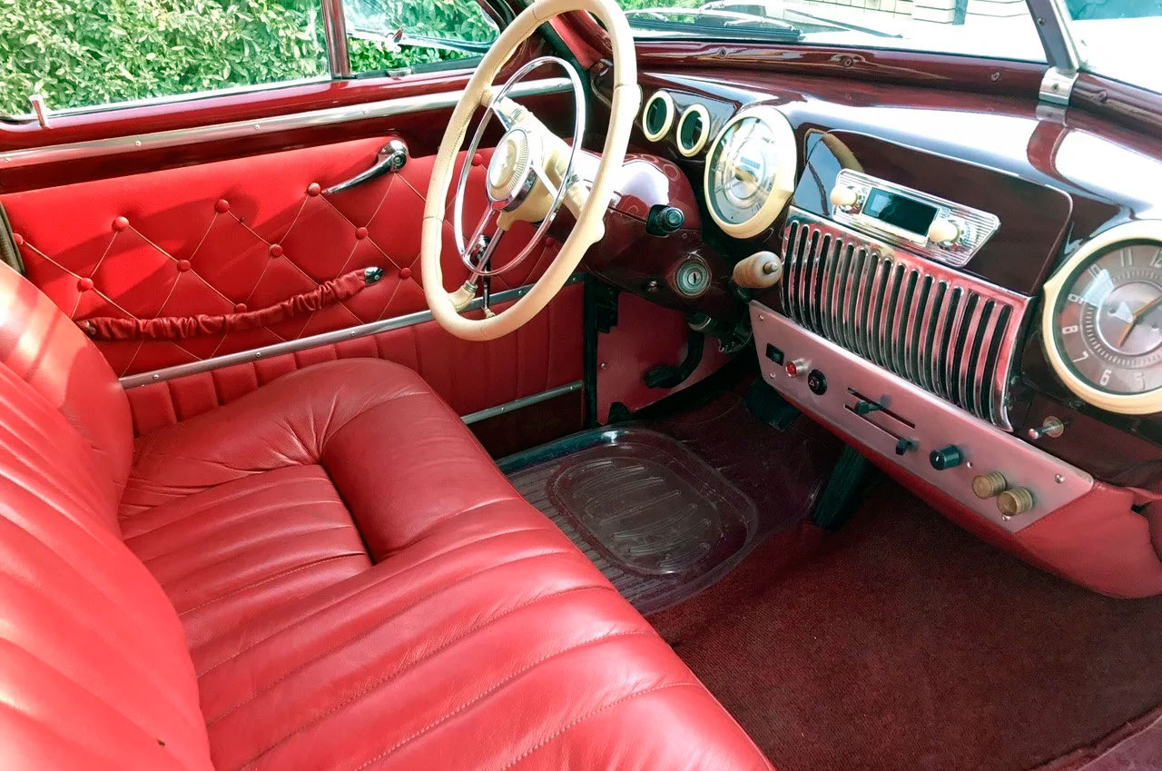 Салон обшит натуральной красной итальянской кожей. Сиденье водителя снабдили электроприводом. Лобовое стекло заменили на триплекс. В переднюю панель органично вписалась современная магнитола с ретро-стилем и всеми необходимыми опциями, такими как Bluetooth, USB, Handsfree.