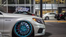 Ну а помимо серьёзного занижения этот автомобиль также может похвастать комплект бесподобных 20-дюймовых колёс Vossen VPS-305, спицы которых загнуты внутрь под углом 30 градусов, благодаря чему они выглядят просто сногсшибательно. При этом бирюзовый оттенок дисков отлично контрастирует с кузовом.