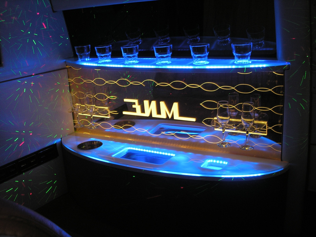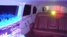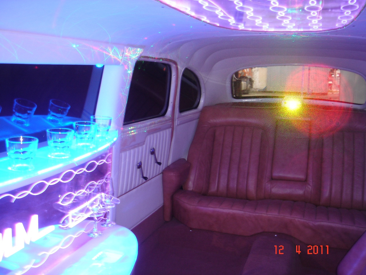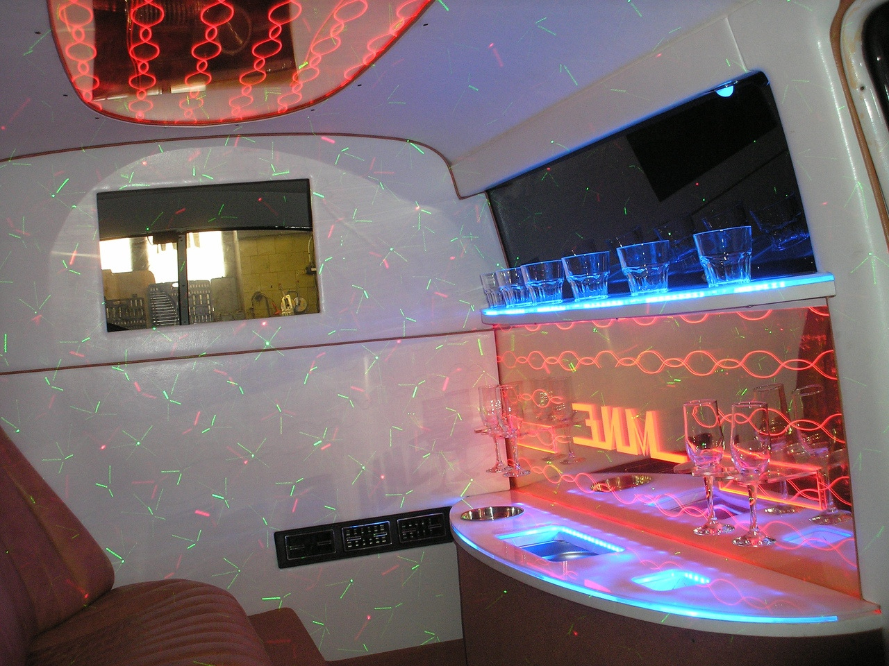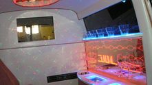 В оснащение входит телевизор с DVD-проигрывателем, камера заднего вида, климат-контроль, зеркальный потолок, подсветка бара и лазерное шоу. Что еще нужно, чтобы достойно отгулять свадьбу, используя для передвижения необычный лимузин?!