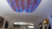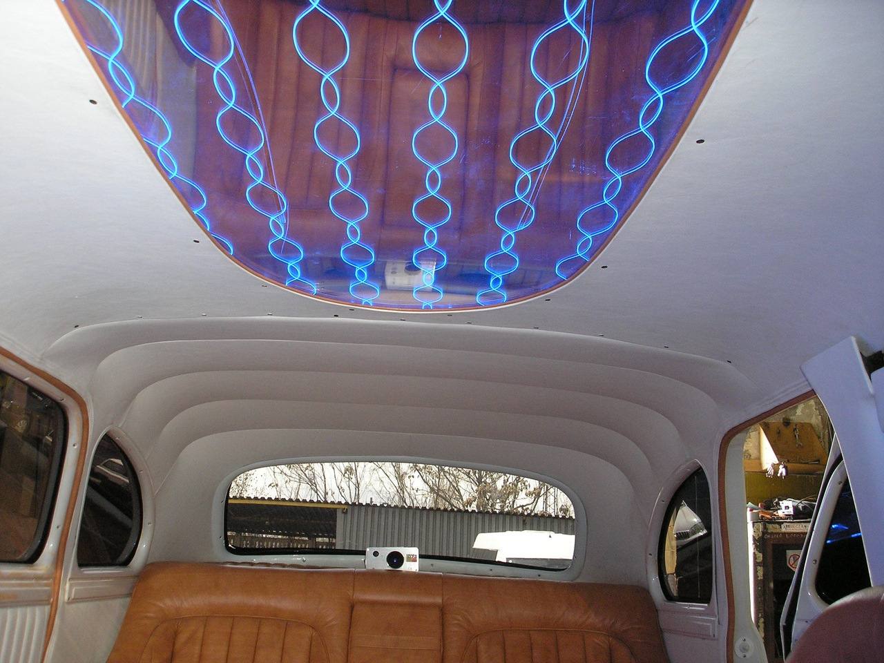 Интерьер оформлен по всем канонам лимузиностроения. Внутри расположено два дивана: один на штатном месте в задней части, а второй — вдоль левого борта. Напротив него — бар с напитками и бокалами на шестерых. Водитель отгорожен он пассажирского отсека самодельной перегородкой с опускающимся стеклом.