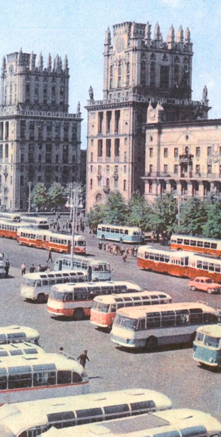 Таким был Минск в 1961 году. На переднем плане автобусный вокзал, где преобладают ЛАЗ-695 и ПАЗ-652. Внимательные увидят трамваи и троллейбусы чуть подальше.