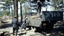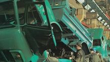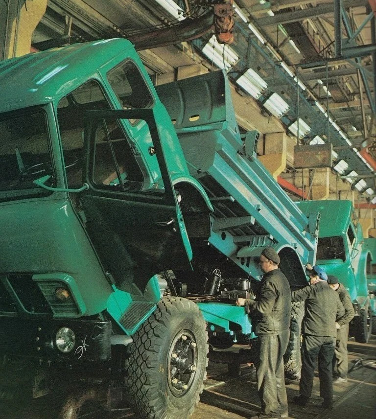 Идет сборка самосвалов МАЗ-5549 на заводе в Минске. До сих пор на дорогах можно встретить эти милые грузовики с округлой кабиной, но уже не в таком состоянии, конечно.