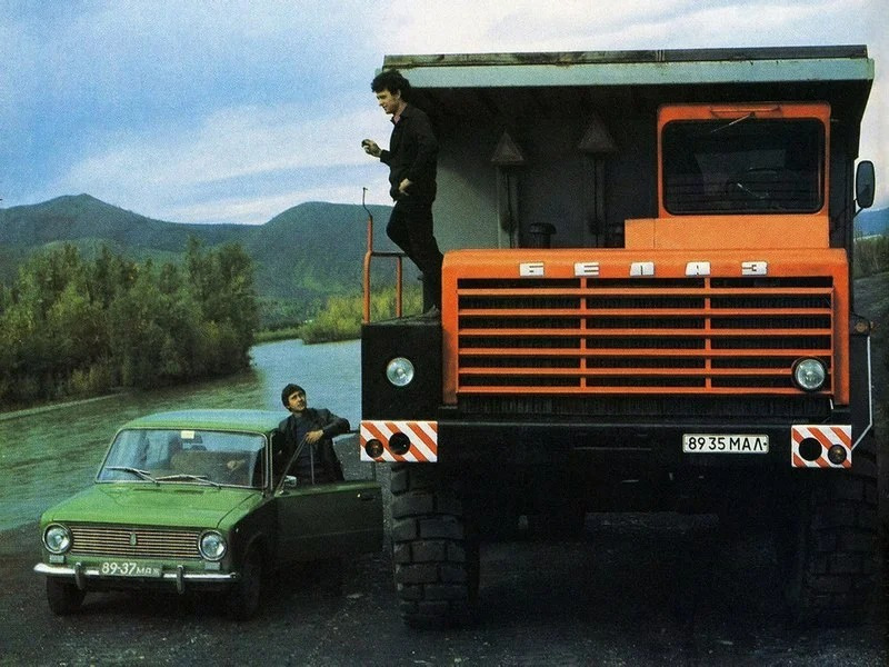 Слон и Моська. БелАЗ-548 и ВАЗ-2101. Разница в размерах - на лицо. Интересно, что буквы на номере БелАЗа - "МАЛ".